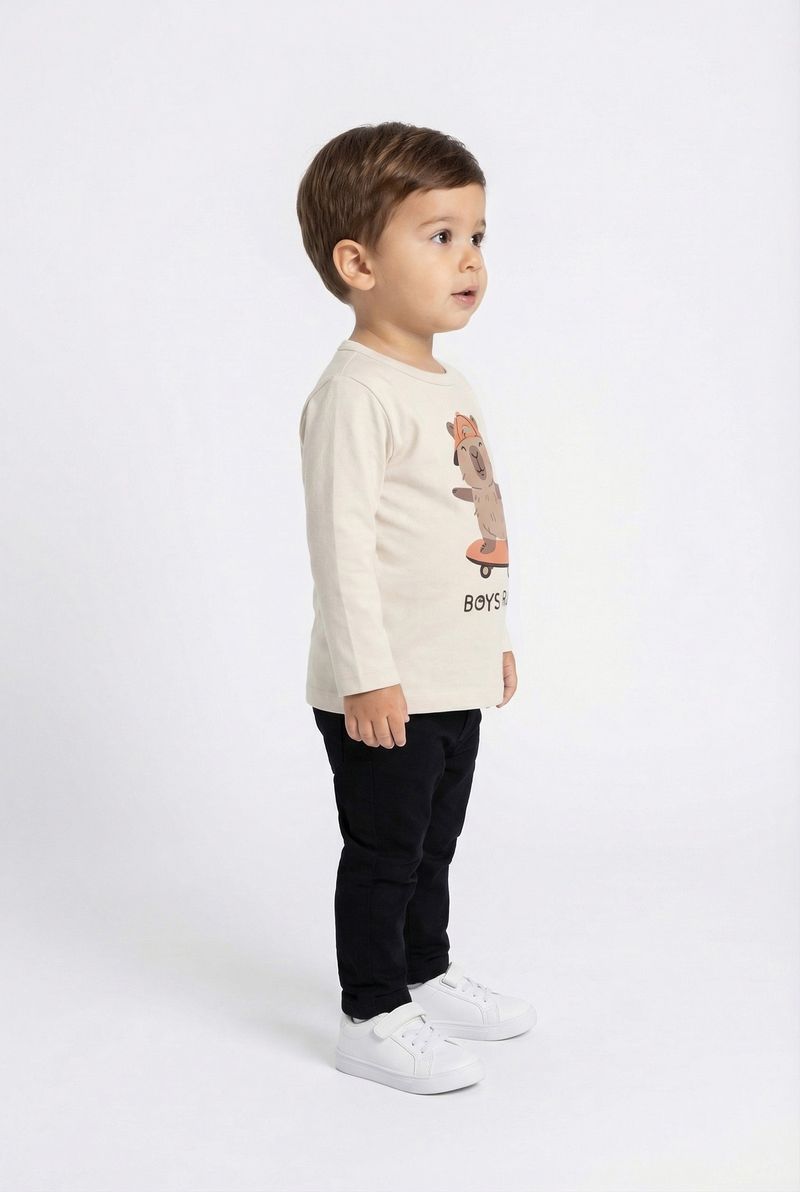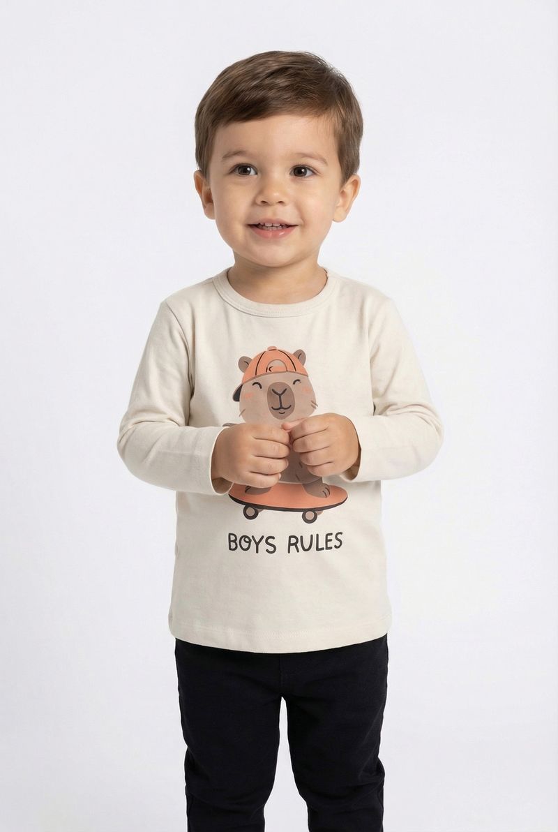A Camiseta Infantil Manga Longa Capivara Skatista Off White da Caedu é perfeita para os pequenos aventureiros! Confortável e estilosa, ideal para o dia a dia. Possui estampa divertida de capivara skatista e a frase "BOYS RULES", feita com algodão macio para garantir liberdade nos movimentos e conforto duradouro. Perfeita para looks divertidos e cheios de personalidade!