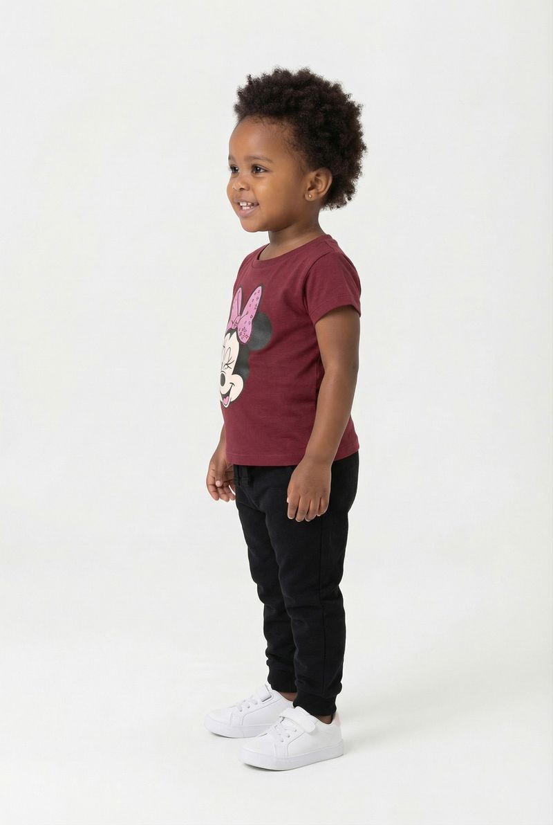 Combine a Blusa Infantil Minnie Mouse com uma calça jogger preta para um visual moderno e confortável, como visto na imagem. Para um toque casual, shorts jeans ou saias coloridas são ótimas opções. Complete o look com tênis brancos para um estilo divertido e prático, ideal para o dia a dia.