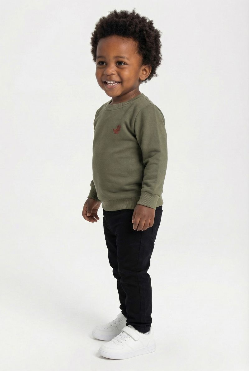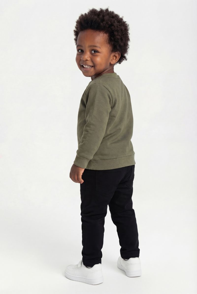 Combine o Moletom Infantil Verde Militar com calças jeans para um look casual e despojado, ou com calças de moletom para máximo conforto. Complete com tênis coloridos e uma jaqueta leve em dias mais frios, criando um visual cheio de personalidade para seu pequeno aventureiro.