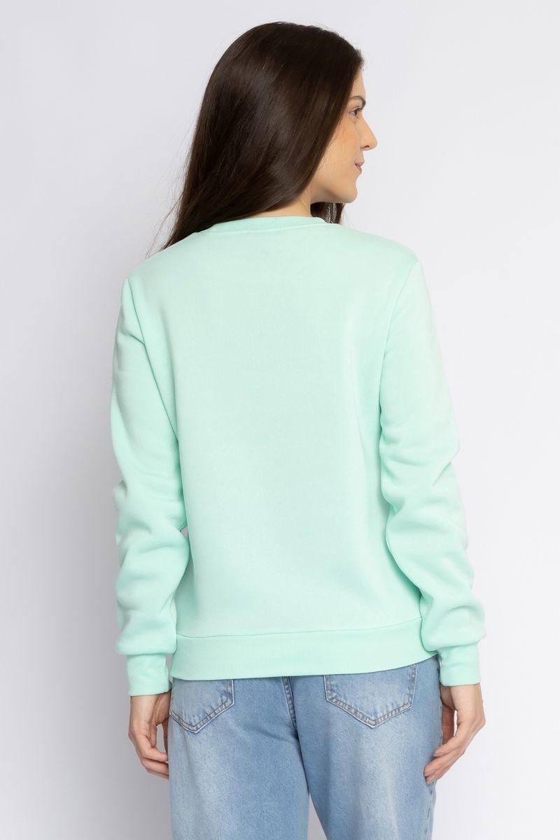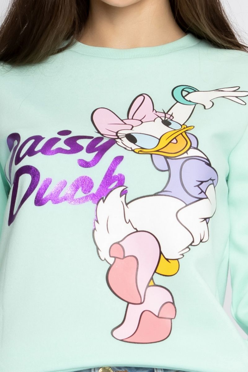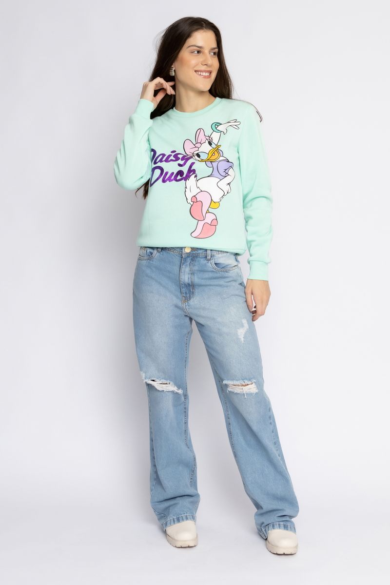 Blusão fechado verde em moletom com gola redonda e mangas longas. Confortável e muito aconchegante o modelo veste bem, é quentinho e seu design fofo com estampa da personagem Margarida da Disney é muito divertido. Ideal para looks jovens e do dia a dia.