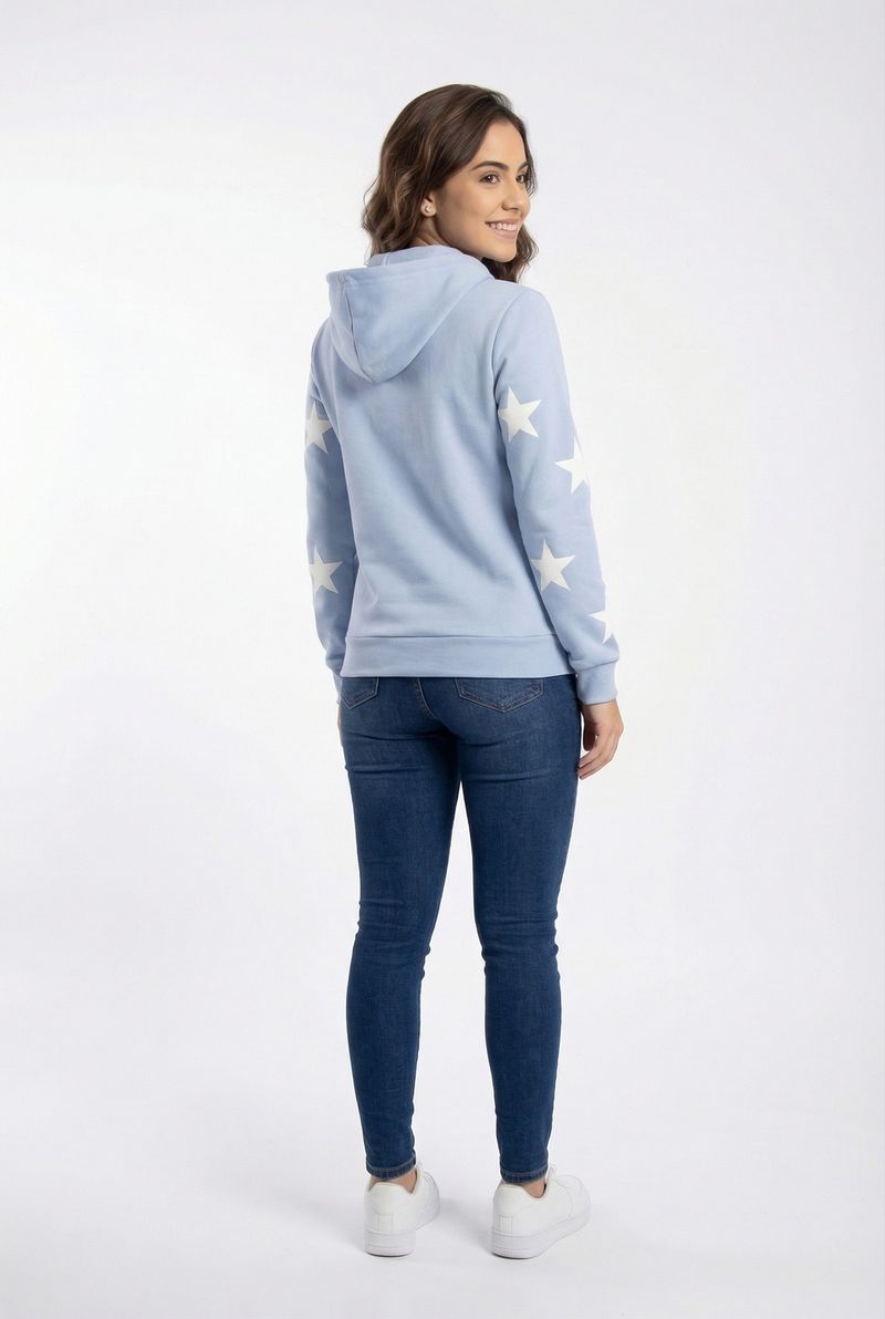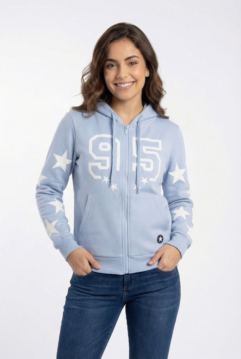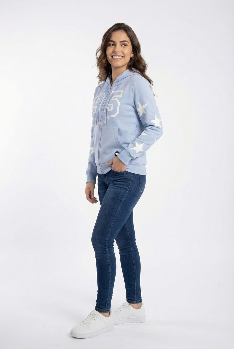 Desperte seu estilo com o Moletom Feminino Caedu! Conforto e moda se unem nesta peça versátil, perfeita para o dia a dia. Com estampa exclusiva de estrelas e o número '95', zíper frontal e capuz, este moletom azul claro é a escolha ideal para quem busca um visual autêntico e cheio de personalidade. Sinta a maciez do moletom com felpa e eleve seu guarda-roupa.