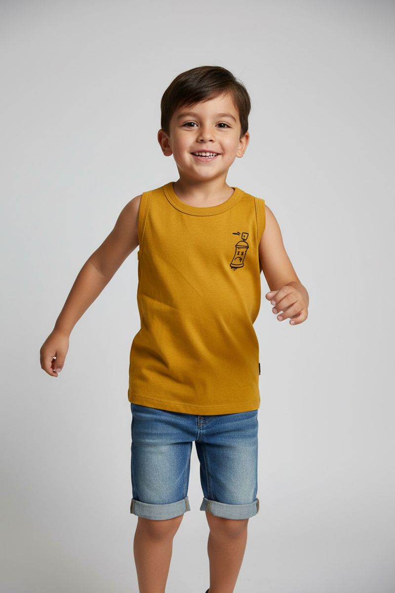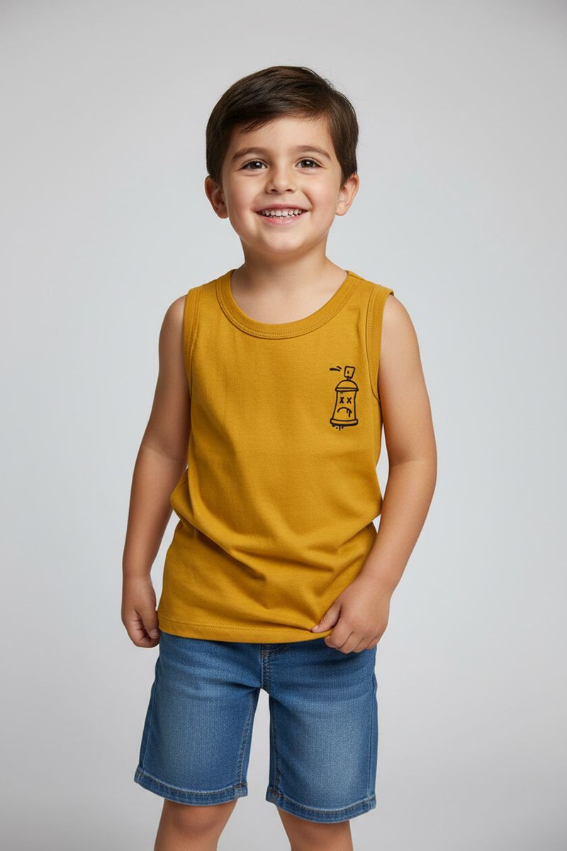 A Regata Infantil Menino Amarela Mostarda Caedu, em 100% algodão meia malha, oferece conforto e maciez. Sua estampa grafite de spray estilizada traz um toque moderno à moda infantil, uma roupa de preço bom.