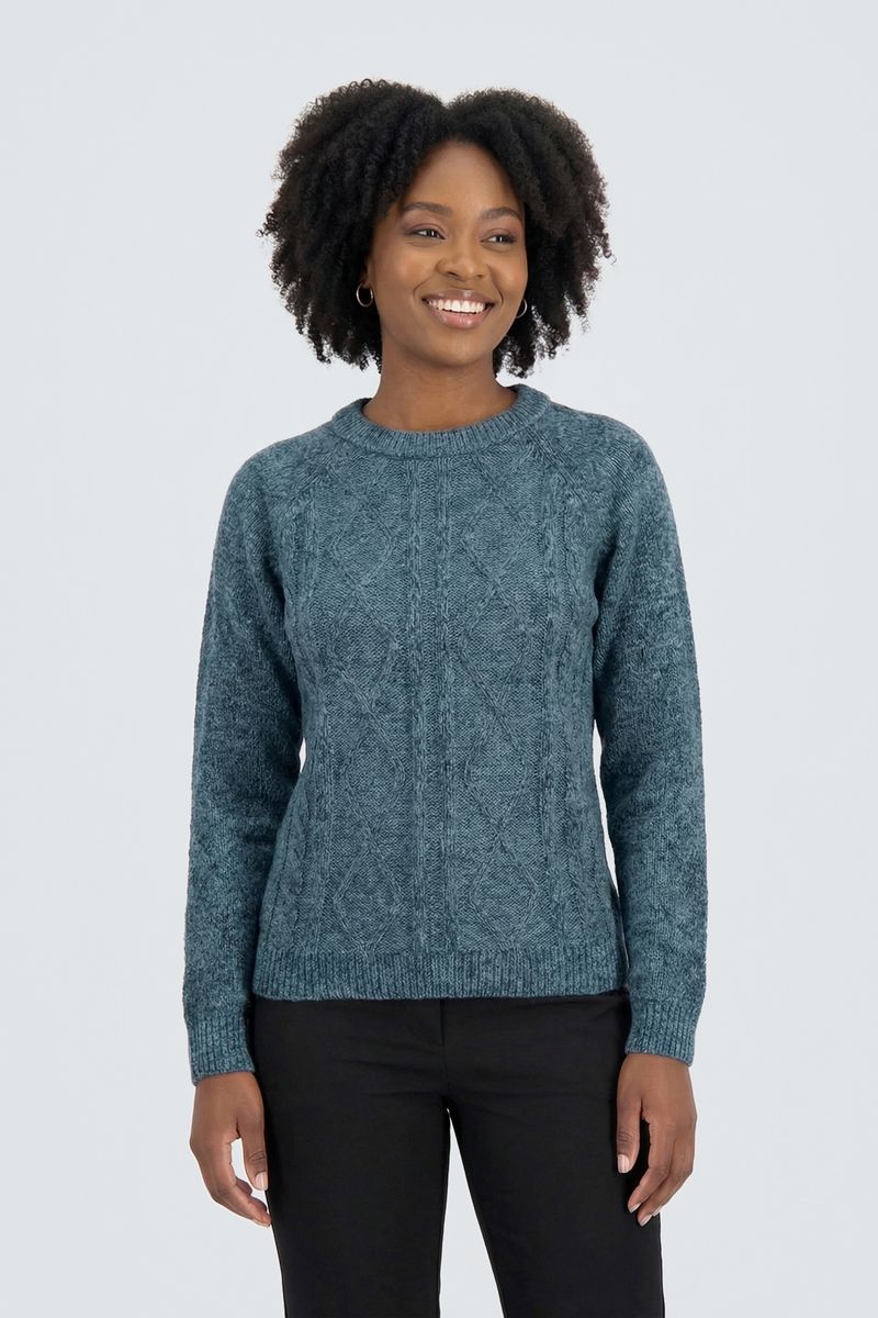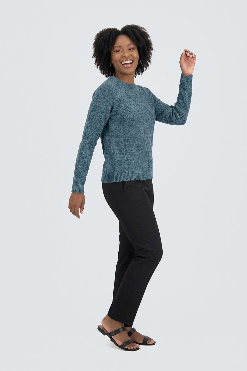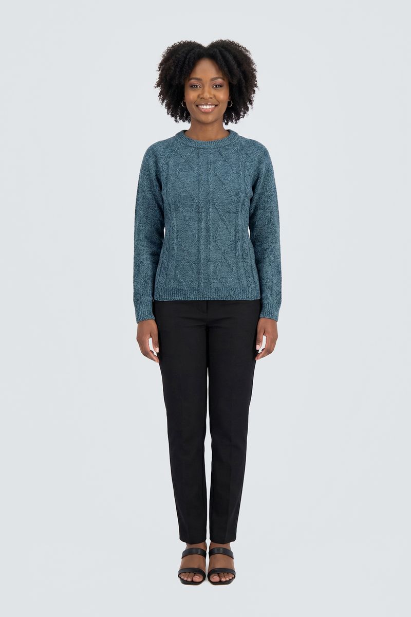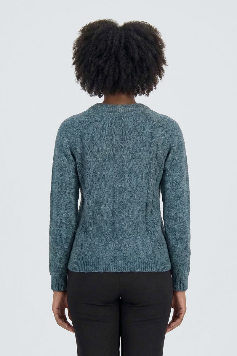 Combine seu suéter azul com uma calça jeans para um visual despojado, ou com uma calça preta de corte reto para um toque mais sofisticado. Para calçados, aposte em botas elegantes ou tênis casuais. Adicione um colar delicado ou brincos discretos para realçar o decote redondo e crie um look completo com uma jaqueta leve se precisar de uma sobreposição.