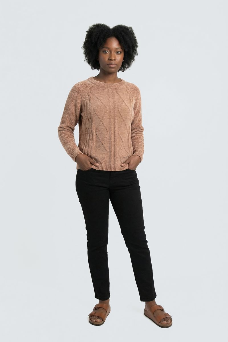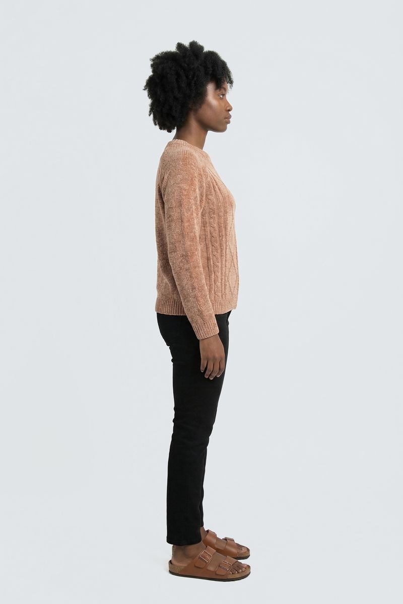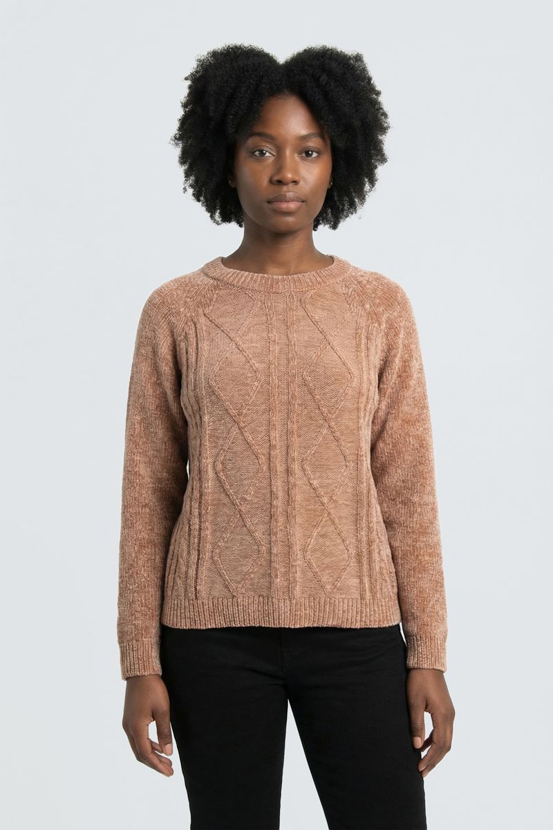 O Suéter Feminino Chenille Bege Caedu eleva sua moda. Com maciez do chenille e tricô trançado, esta roupa em tom terroso oferece conforto e estilo. Um visual sofisticado e aconchegante para você brilhar.