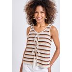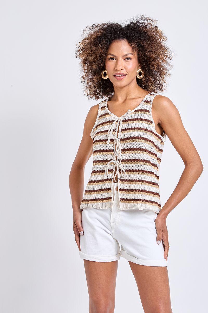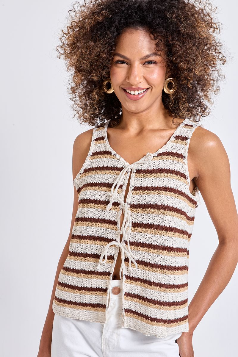 Desperte seu estilo com a Regata Tricot Crochê Listrada Caedu! Com design estampado, decote em V e amarração frontal, esta peça em tricot oferece um toque arejado e rendado, ideal para quem busca moda e conforto. Uma roupa versátil para diversas ocasiões.