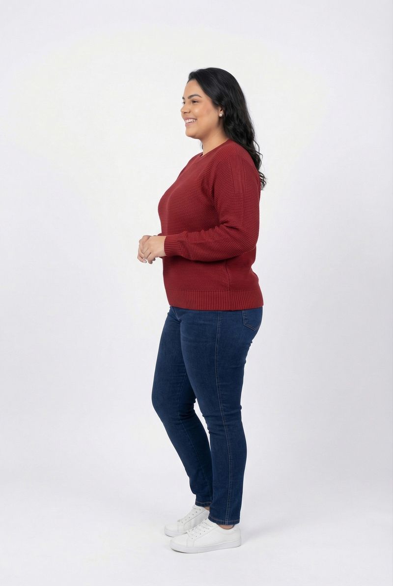 Combine seu Suéter Feminino Tricot Canelado Conforto Vermelho Cobre com calças jeans para um visual casual e moderno. Para um toque mais sofisticado, experimente com saias midi e botas. Adicione tênis brancos para um estilo despojado ou acessórios como colares e brincos para realçar sua beleza e criar um look completo.