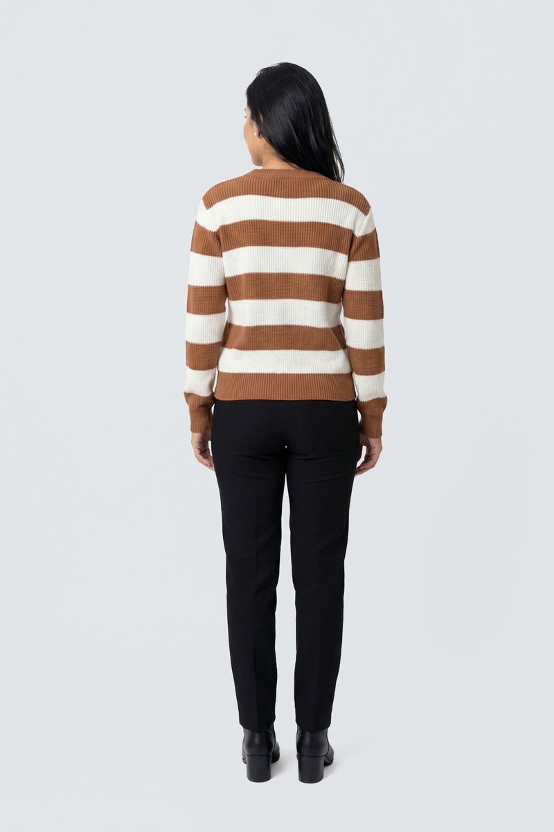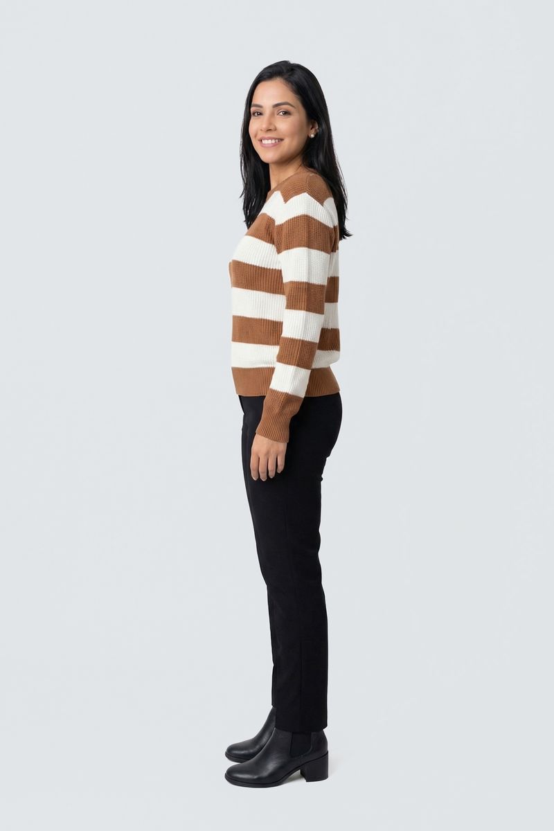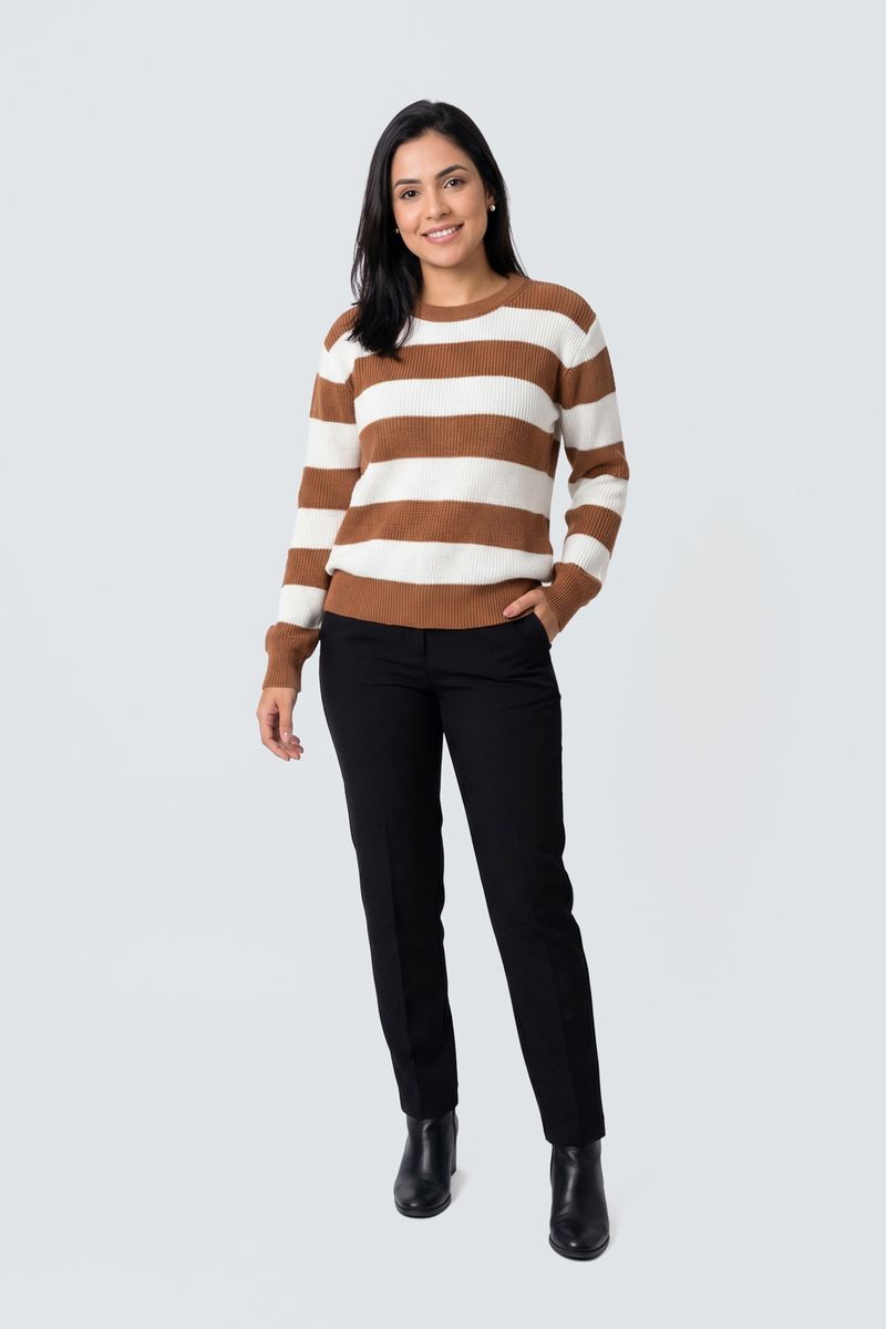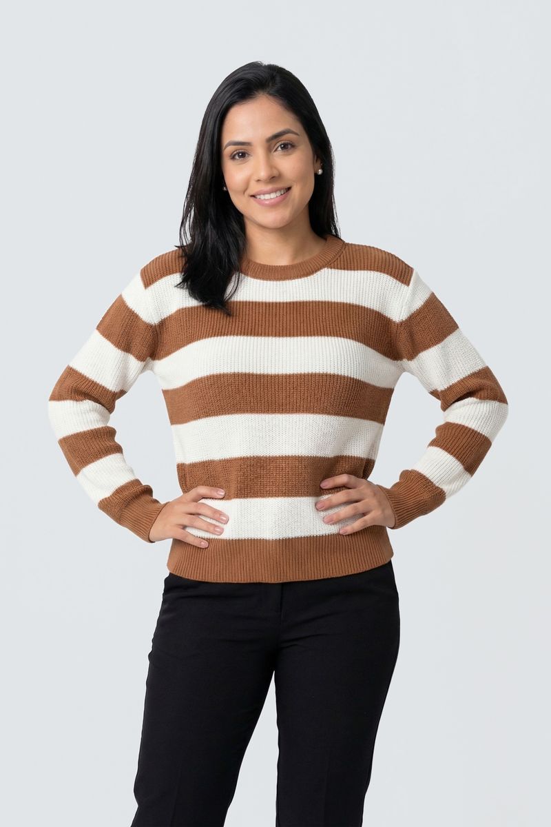 Sinta o abraço do conforto e a elegância atemporal com o Suéter Feminino Tricot Listrado Caedu. Confeccionado em tricot macio, este suéter com listras caramelo e off-white e gola redonda é a roupa ideal para quem busca moda e bem-estar.