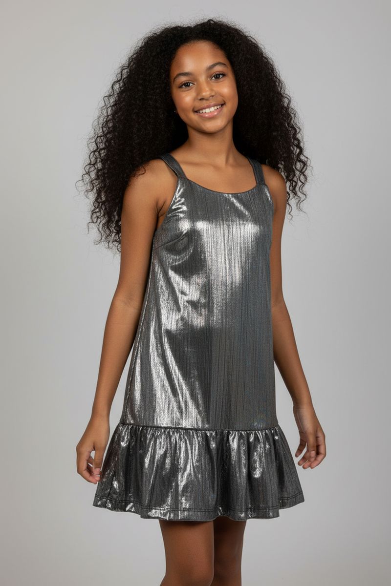 Deslumbre com o Vestido Infantil Prata Cintilante com Babado da Caedu! Confeccionado em Lurex, esta peça única oferece um brilho intenso e um toque festivo. Com decote quadrado e babado volumoso, é a escolha perfeita para momentos especiais, garantindo estilo e conforto para as pequenas fashionistas.