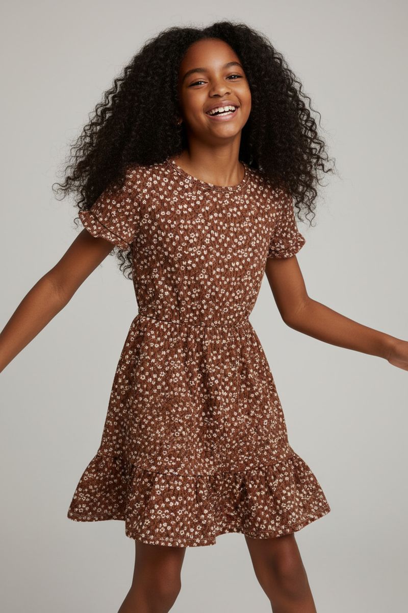 roupa perfeita para sua pequena. Com estampa floral miúda, mangas curtas com babados e cintura franzida, ele oferece charme e conforto. Ideal para momentos especiais, este vestido da