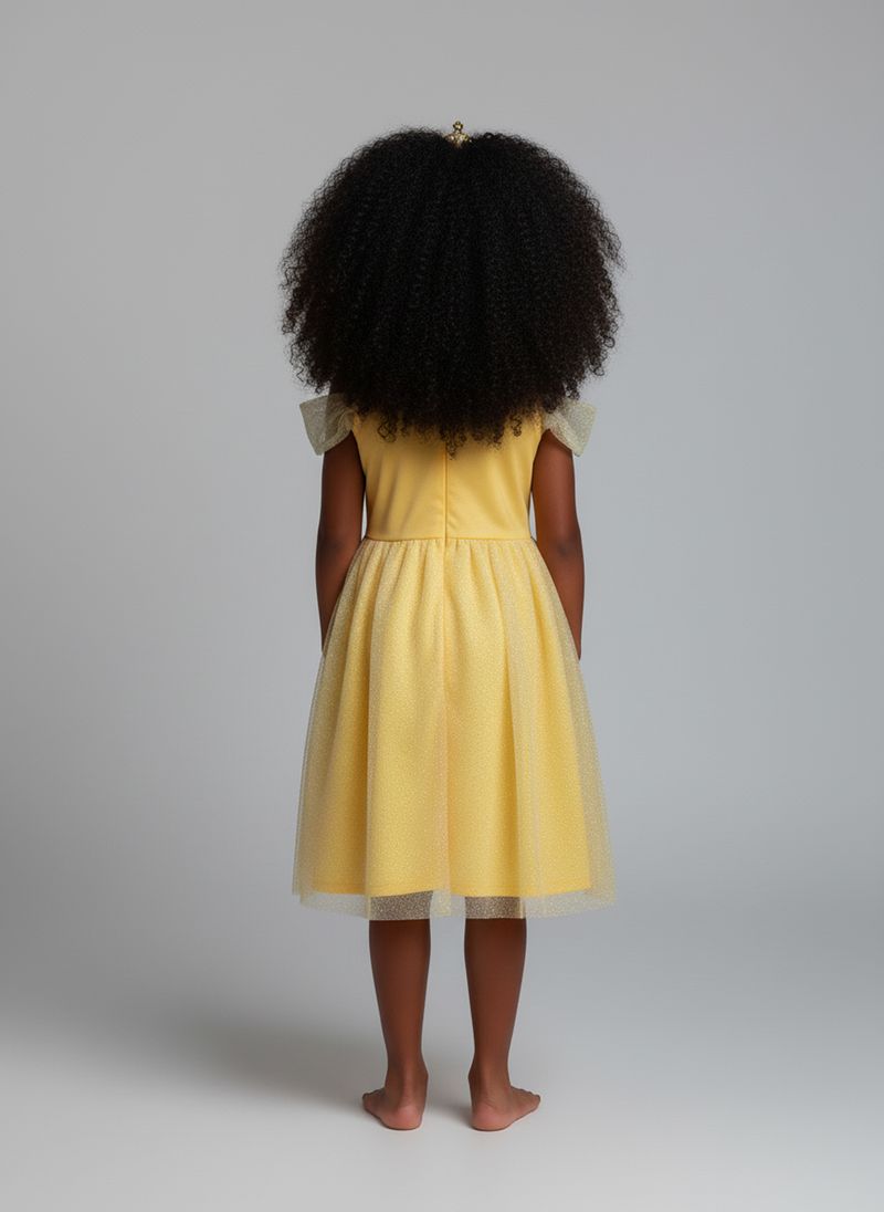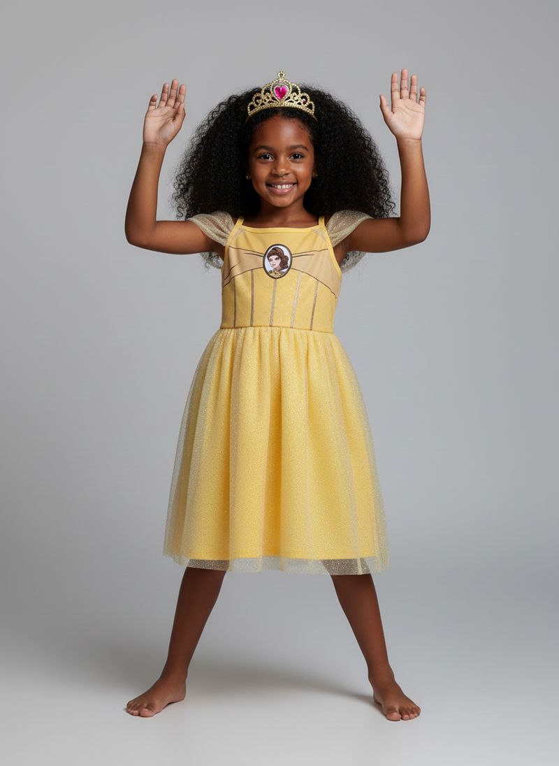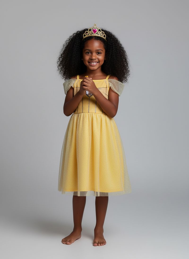 Combine este vestido de princesa com sapatilhas douradas ou sandálias delicadas para um visual completo. Para um toque extra de magia, adicione luvas brancas ou uma varinha de condão. O brilho do tule e da tiara já são o destaque, complementando com acessórios simples e elegantes.