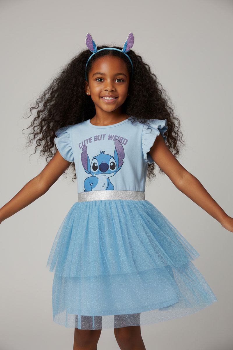 Combine este vestido encantador com sapatilhas delicadas para um look mais formal, ou tênis brancos para um toque despojado e confortável. Uma jaqueta jeans pode ser adicionada em dias mais frescos, e a tiara azul claro com orelhas roxas, que ecoa o Stitch, completa o visual com muito charme.