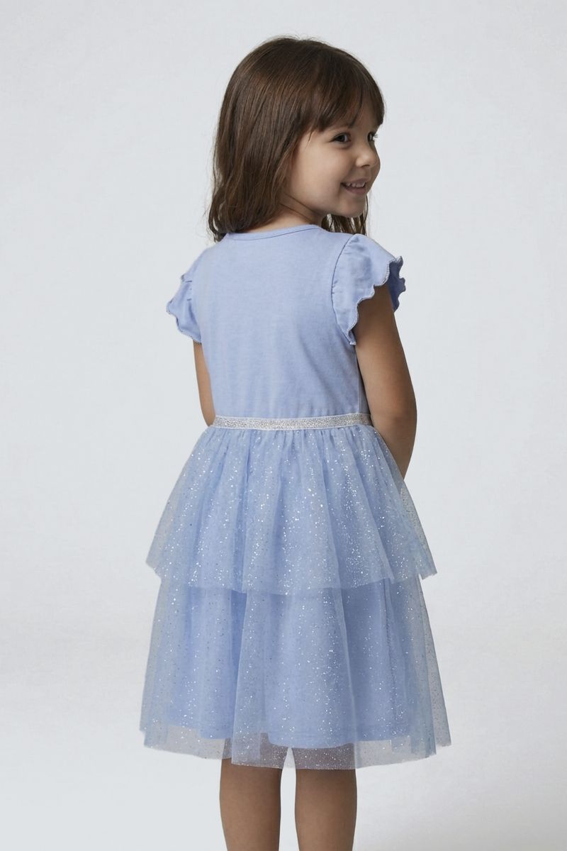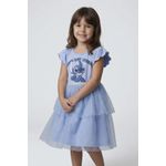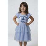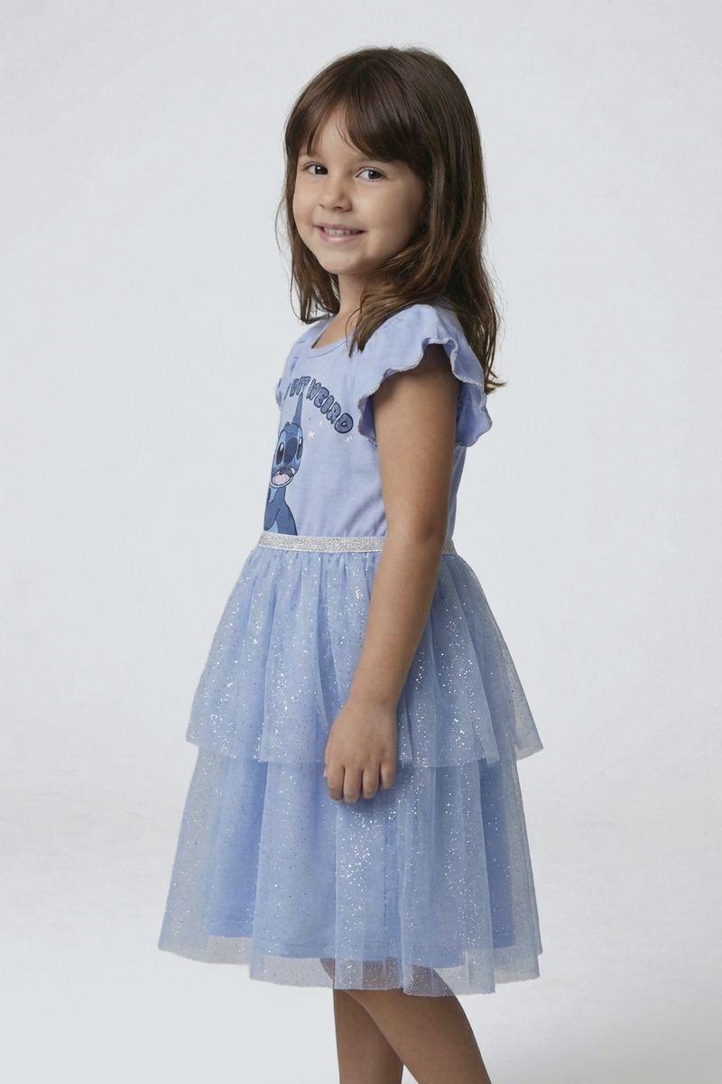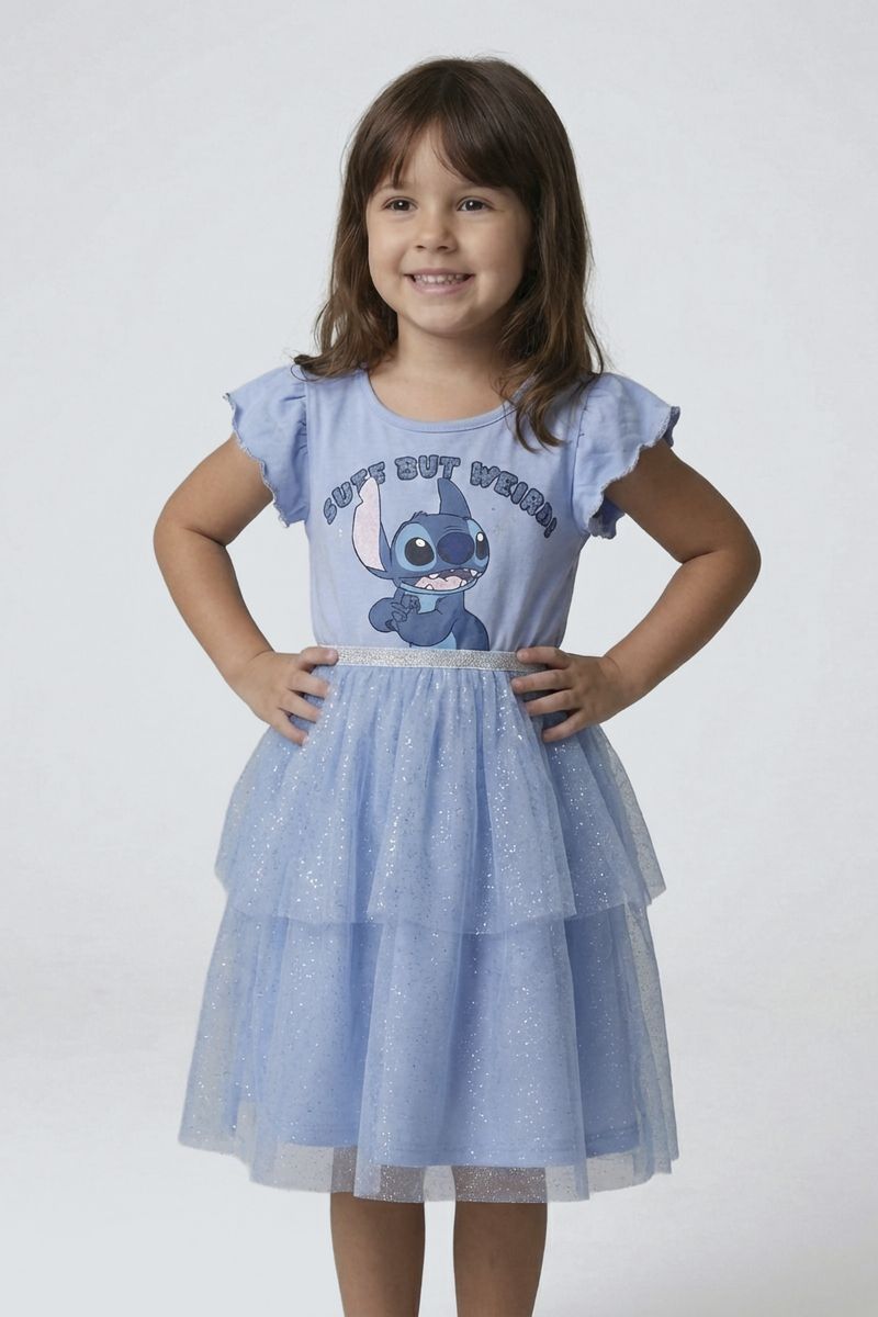O Vestido Infantil Stitch Azul Claro Caedu é a escolha perfeita para encantar as pequenas! Com estampa vibrante do Stitch, saia de tule duplo brilhante e mangas babado, ele oferece conforto e um toque mágico para qualquer ocasião. Uma roupa infantil que une diversão e estilo.
