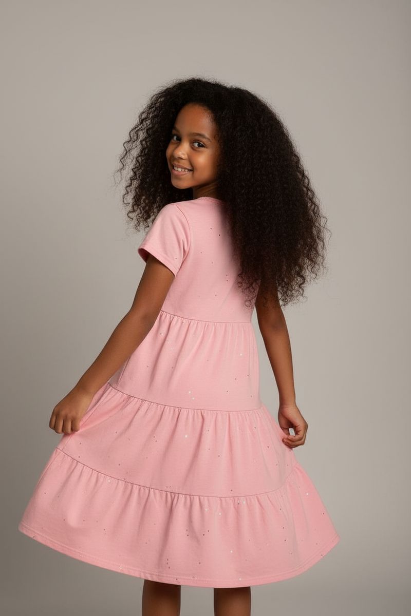 O Vestido Infantil Rosa Claro com Glitter e Saia de Camadas é puro encanto. Em meia malha, oferece conforto e leveza. Com glitter e saia de babados, proporciona um visual cintilante e movimento para sua pequena.
