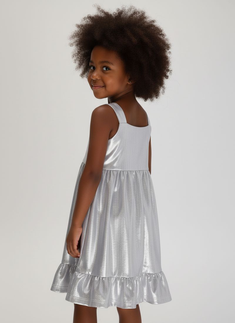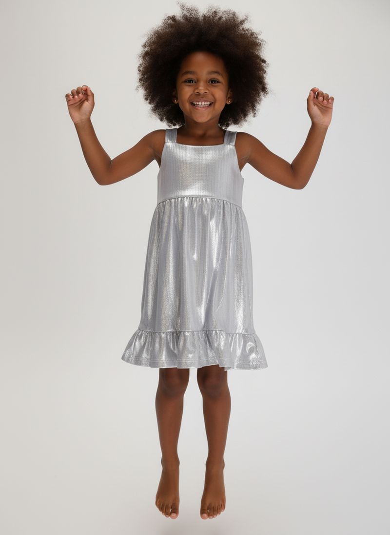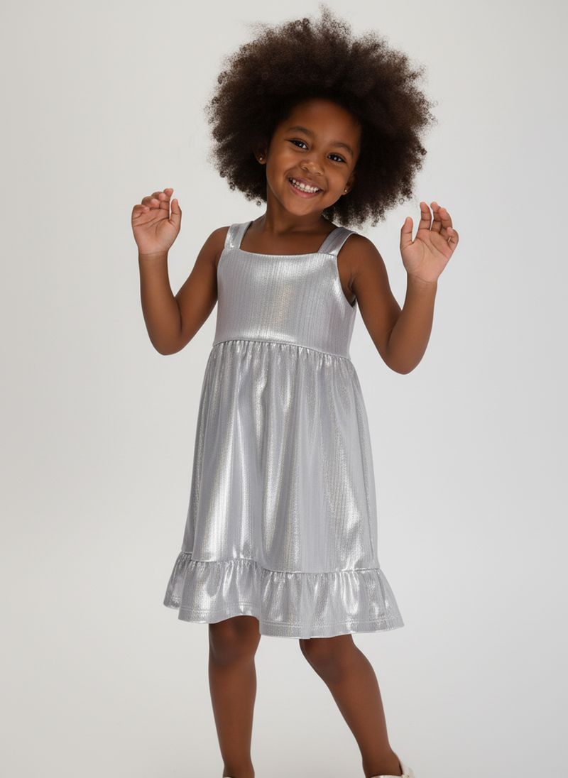 O Vestido Infantil Lurex Prata com Babado Caedu é perfeito para sua pequena brilhar! Com tecido lurex prateado cintilante, alças largas e babado na barra, oferece um look festivo e confortável. Ideal para momentos especiais, este vestido de moda infantil é puro encanto.