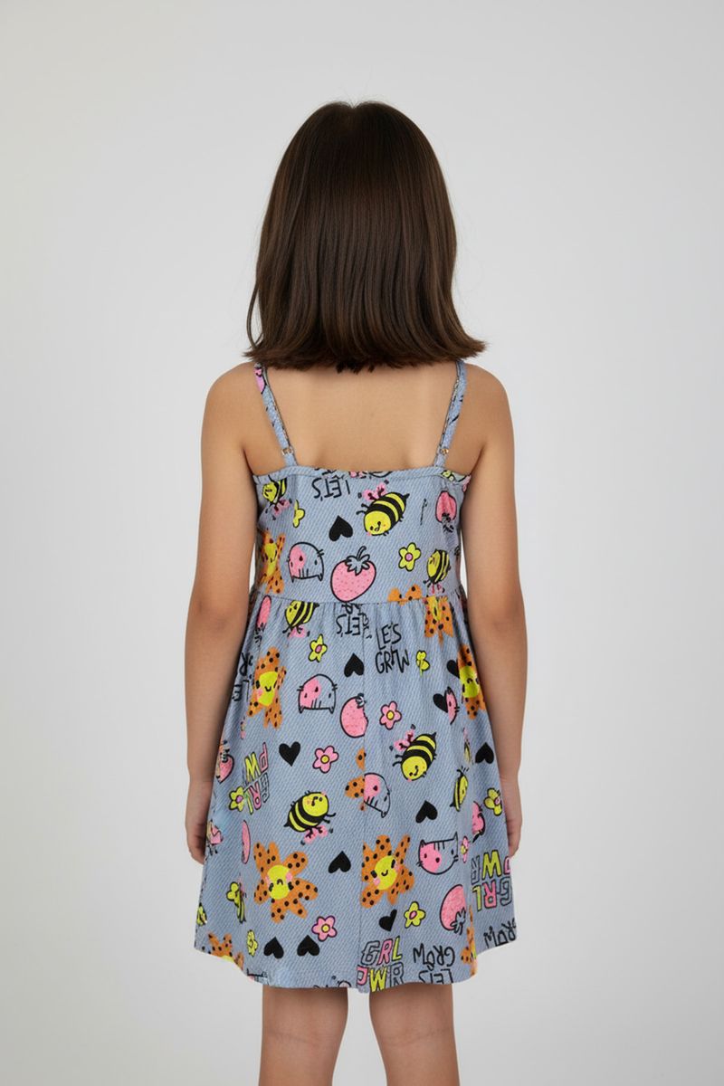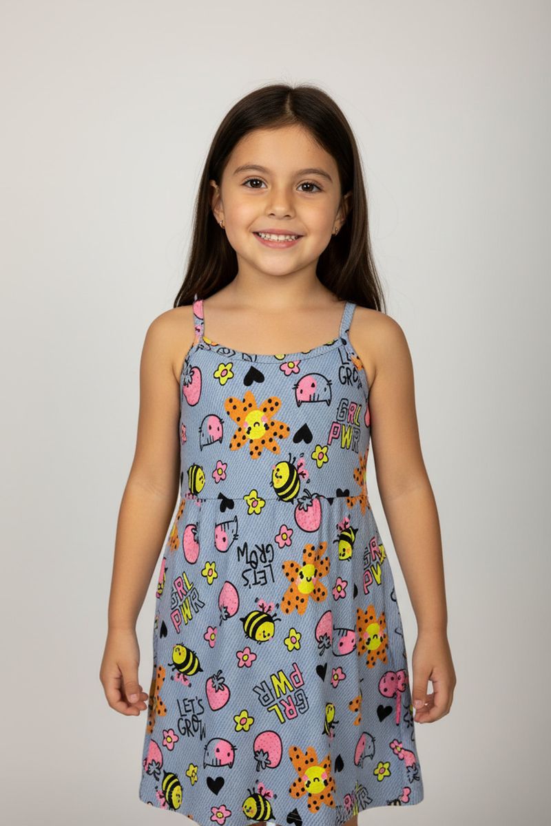 meia malha oferece conforto e leveza, com caimento solto e evasê. Sua estampa vibrante de abelhas, morangos e frases como 'GRL PWR' torna-o a