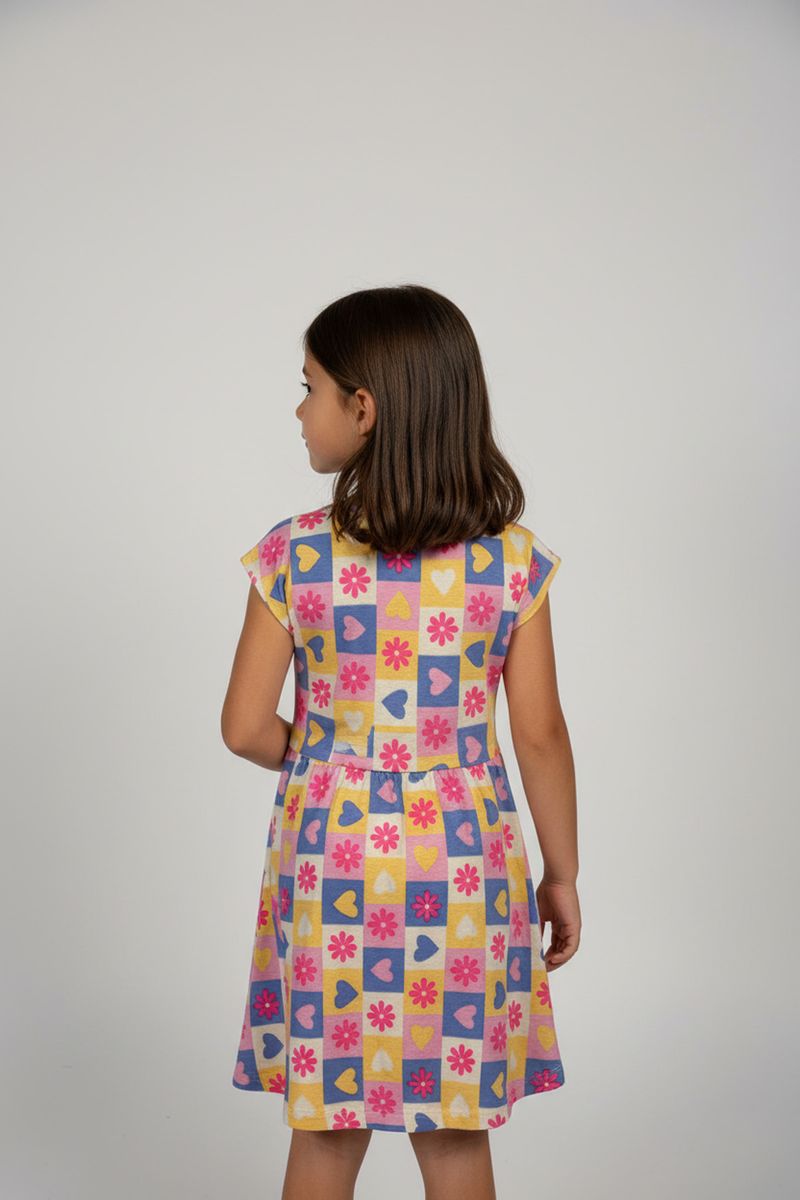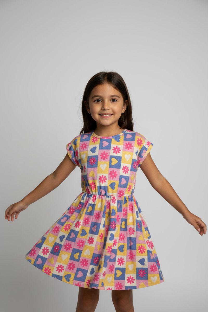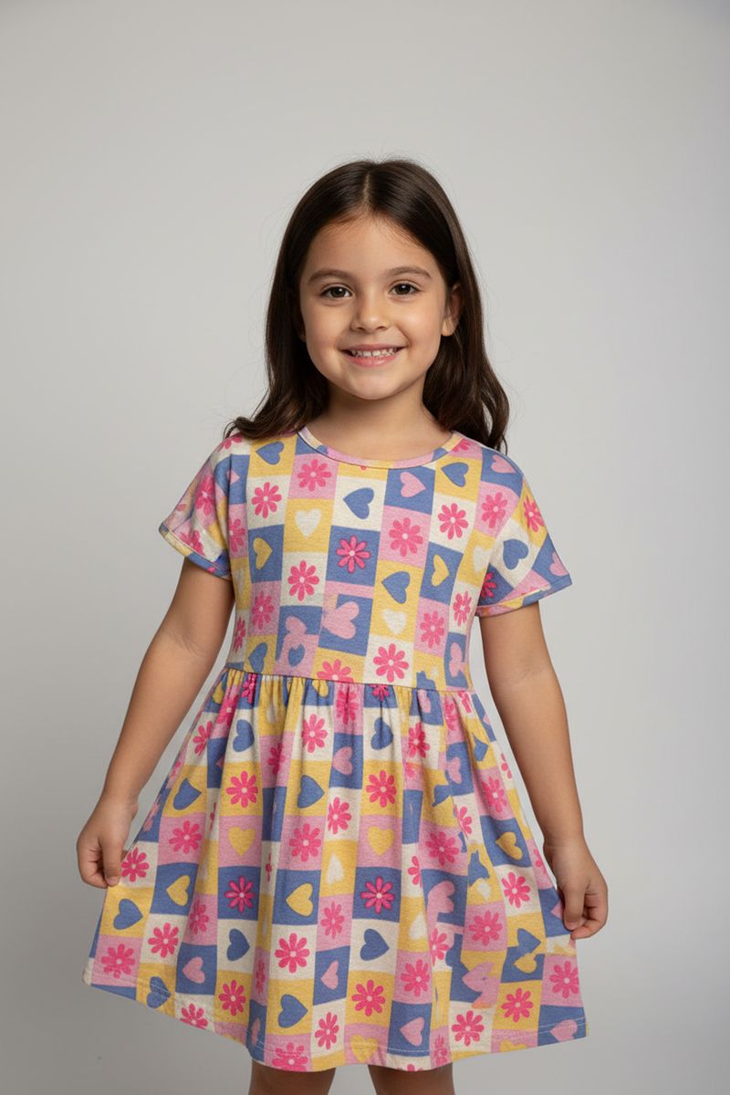 Inspire a alegria com o Vestido Infantil Caedu! Confeccionado em meia malha, oferece conforto e leveza. Sua estampa vibrante de corações e flores em quadrados coloridos e cintura marcada garante um visual encantador, perfeito para a moda infantil. Encontre esta roupa barata na loja virtual Caedu.
