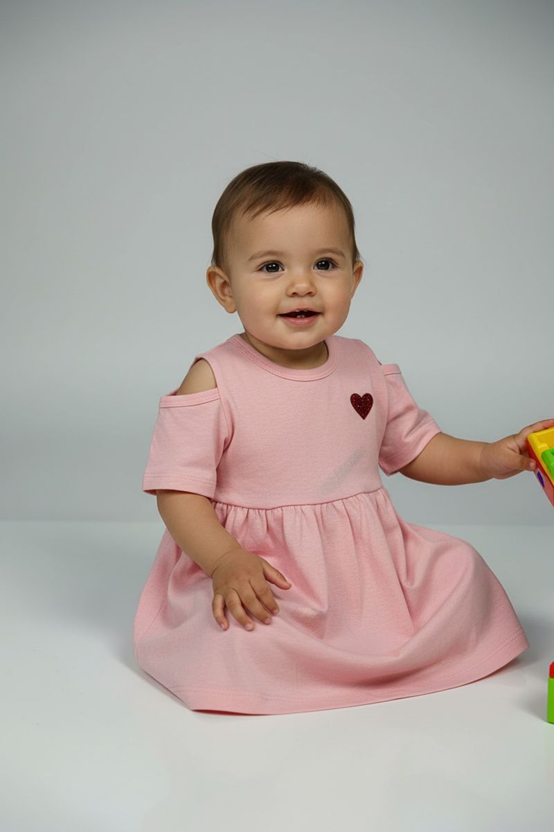O Vestido Infantil Menina Caedu, em 100% algodão, proporciona conforto. Com ombro vazado e coração glitter, garante estilo e delicadeza. Uma roupa infantil perfeita para sua pequena, na Caedu.