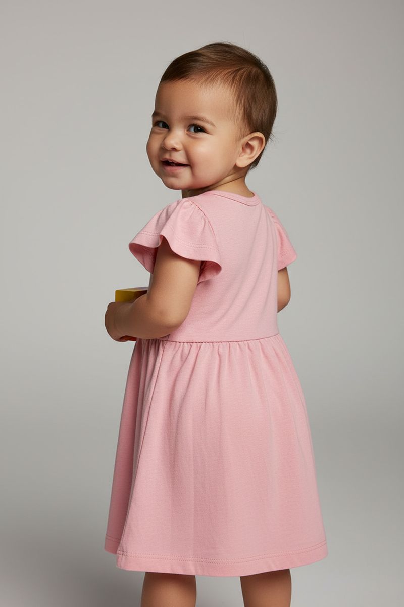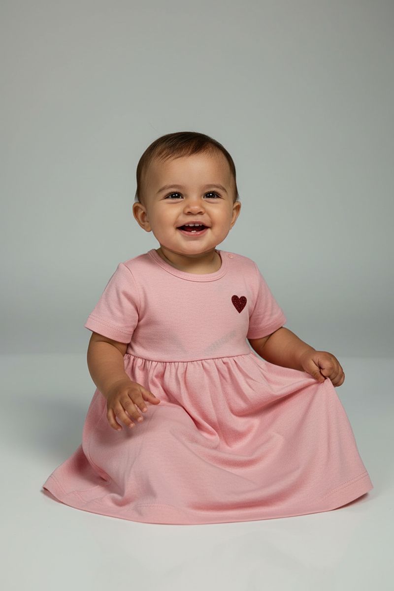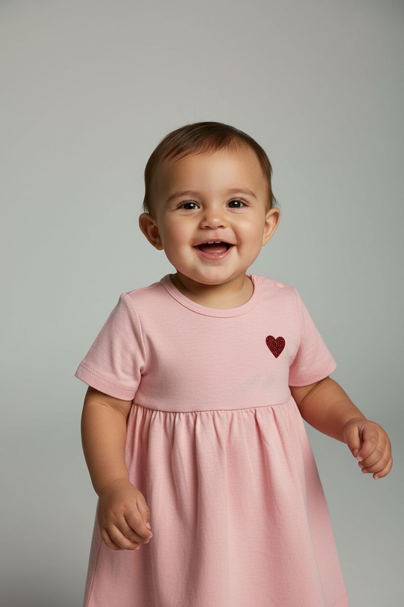 Combine o Vestido Bebê Rosa com sapatilhas brancas ou sandálias. Adicione um laço de cabelo ou tiara para fofura. Para dias frescos, um cardigã leve em tom neutro complementa o look, criando um conjunto versátil e charmoso.