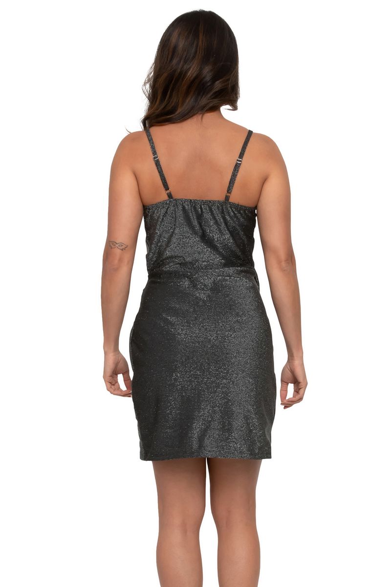 Vestido feminino fashion brilhante, modelo curto, confeccionado em tecido lurex. Possui transpasse, decote V e alças finas.