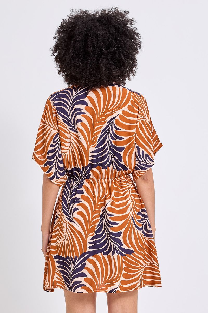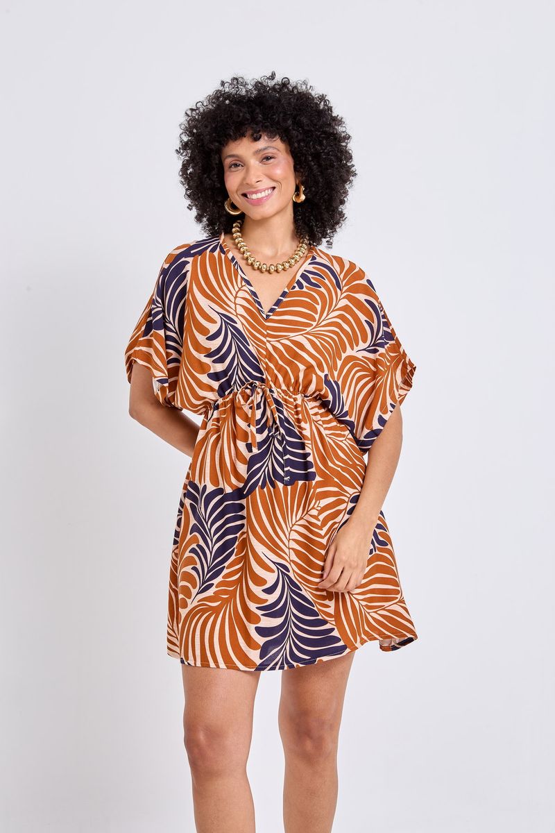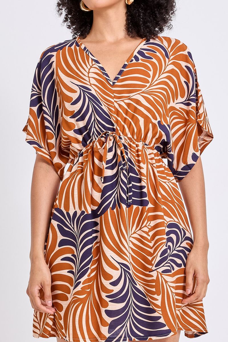 Realce sua beleza com o Vestido Midi Feminino Caedu. Confeccionado em viscose, oferece caimento impecável e conforto. Com estampa de folhagem sofisticada, decote V e amarração na cintura, é a escolha perfeita para um look elegante e moderno.