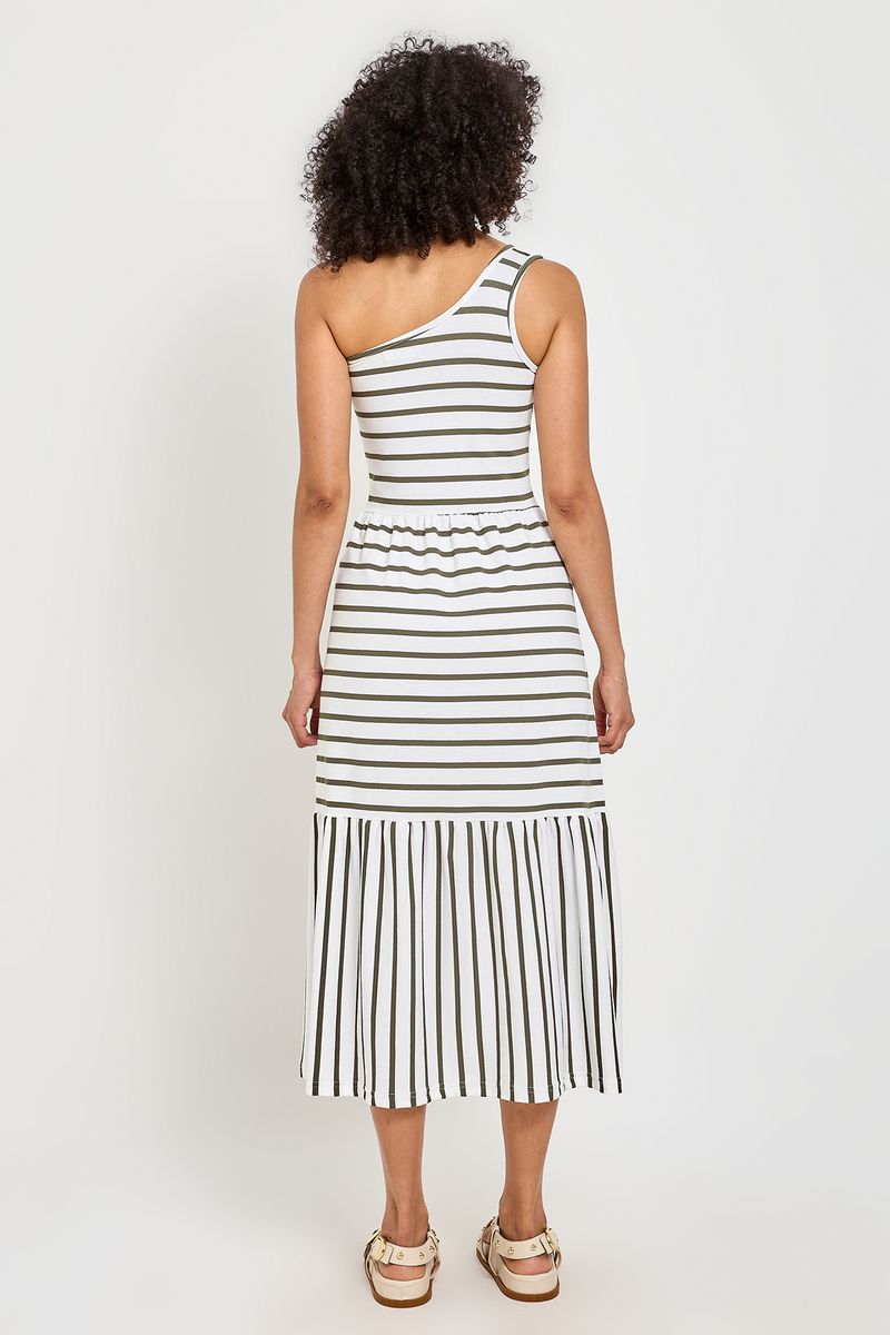 O Vestido Midi Feminino Ombro Único Listrado Três Marias Caedu, em poliéster, oferece elegância e conforto. Com design estampado de ombro único e listras, cria um visual moderno e sofisticado para a mulher.