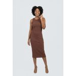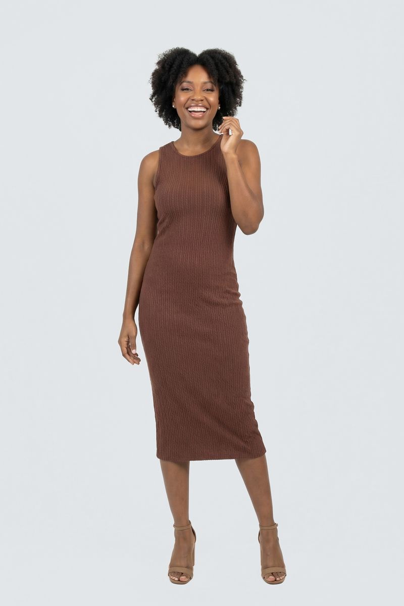 Eleve seu estilo com o Vestido Midi Canelado Feminino Marrom Chocolate Caedu. Tom terroso, ícone da moda, oferece elegância e versatilidade. Design sem mangas, canelado e silhueta justa garantem sofisticação e conforto, ideal para quem busca praticidade e estilo em uma única peça. Combine com acessórios e arrase!
