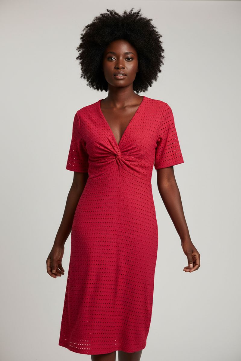 Realce sua beleza com o Vestido Midi Feminino Laise Vermelho Caedu. A vibrante cor e a textura laise trazem sofisticação e conforto. Com decote V e detalhe torcido, ele valoriza sua silhueta, sendo essencial na moda Caedu. Ideal para um look moderno e elegante.