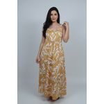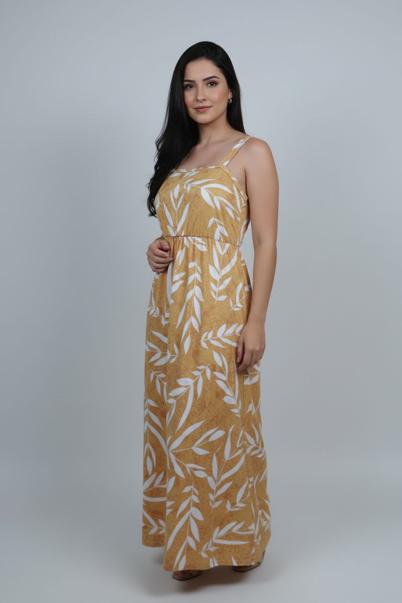 Deslumbre com o Vestido Longo Feminino Estampado Tropical Folhas Mostarda Caedu. Em tecido macio, este vestido de alças com estampa de folhas oferece elegância e conforto. A cintura marcada e modelagem evasê valorizam a silhueta, ideal para moda feminina.