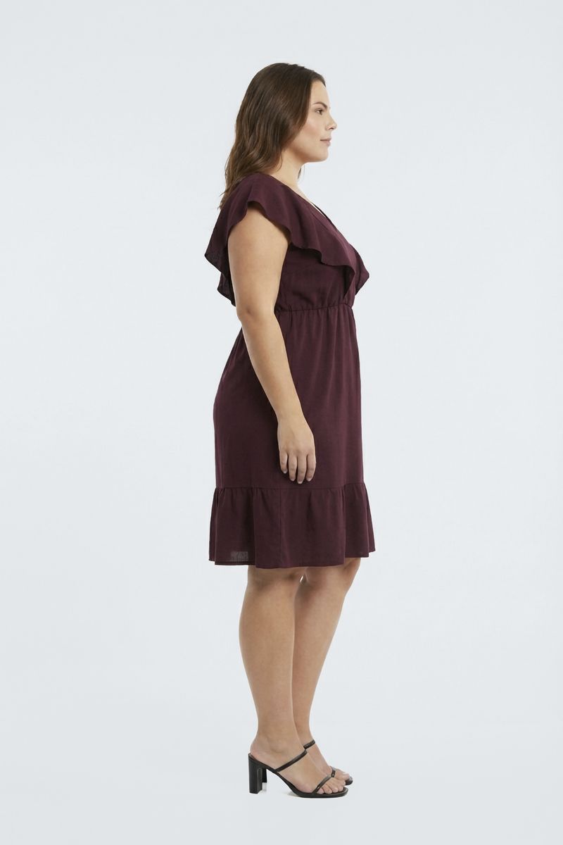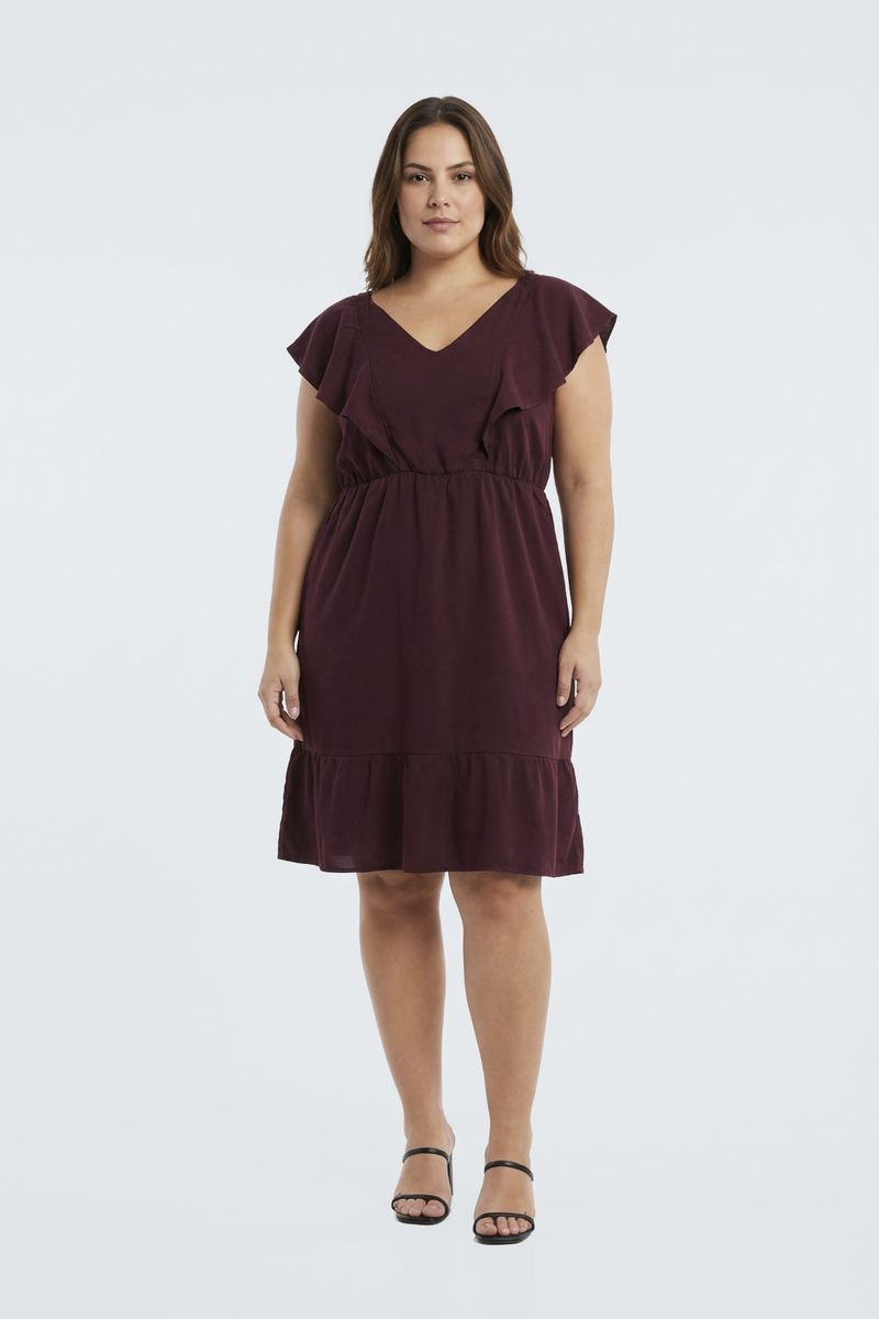Sinta-se deslumbrante com o Vestido Feminino Vinho Caedu. Com decote V e babados charmosos, este vestido define sua silhueta com elegância e conforto. Perfeito para quem busca moda e estilo em uma única roupa, realçando sua beleza natural.