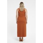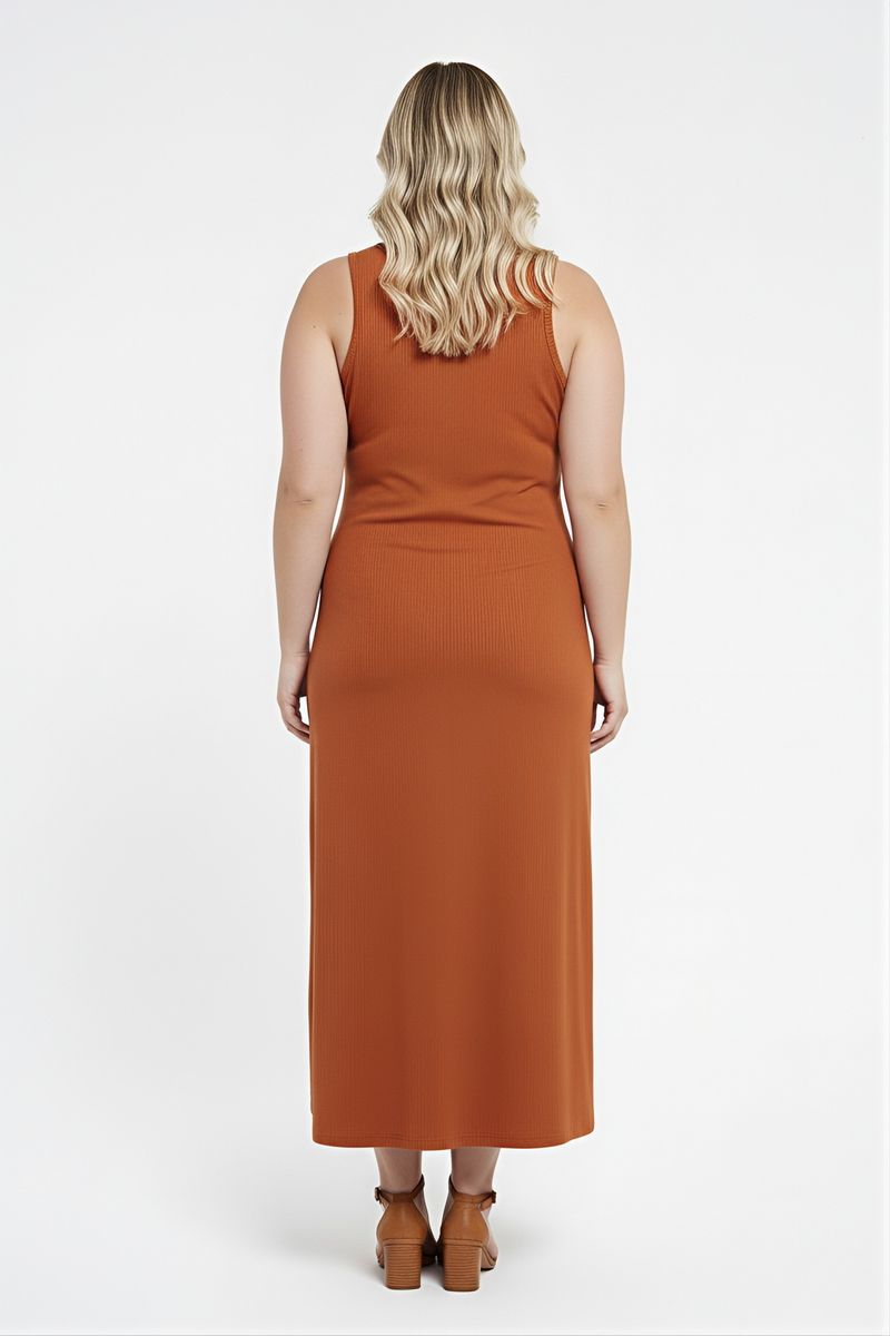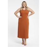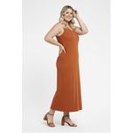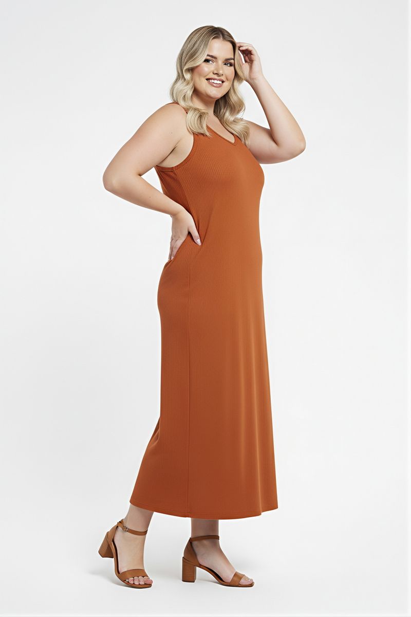 Descubra a moda Caedu com o Vestido Midi Feminino Malha Canelada Terracota. Esta roupa versátil, com decote V e alças finas, oferece conforto e elegância. Brilhe em qualquer ocasião com esta peça de bom preço, realçando sua beleza com sofisticação.