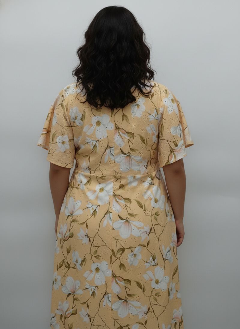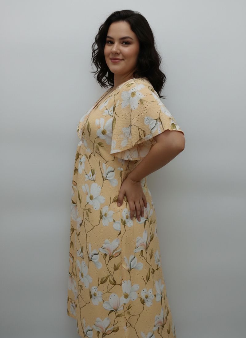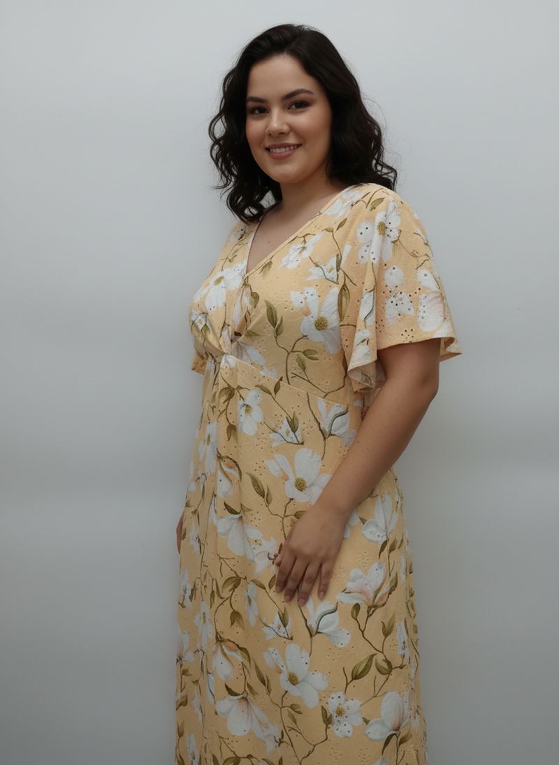 Desperte sua beleza com o Vestido Midi Floral Amarelo Caedu. Confeccionado em LAISE leve e fluida, este vestido estampado com decote V e torção na cintura modela a silhueta, oferecendo um visual elegante e confortável. Perfeito para quem busca moda e estilo em uma única peça, ideal para realçar sua feminilidade com um toque de sofisticação. Combine com acessórios e arrase!
