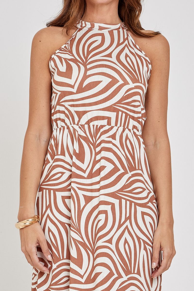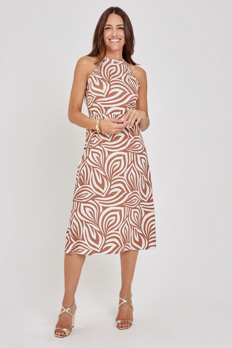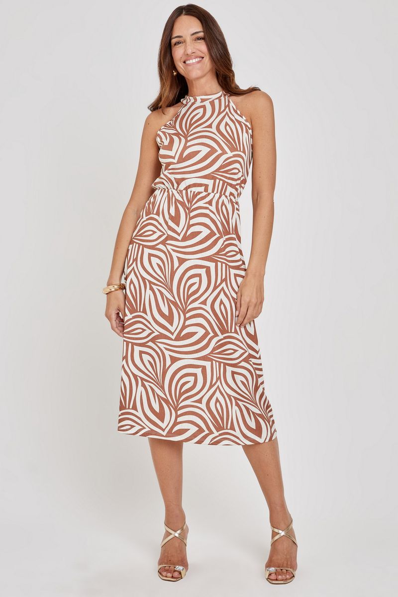 Deslumbre com o Vestido Midi Feminino Halter Estampa Orgânica Caedu. Confeccionado em helanca, oferece conforto e caimento fluido. Com decote halter e cintura marcada, esta roupa estampada é ideal para um visual moderno e elegante.