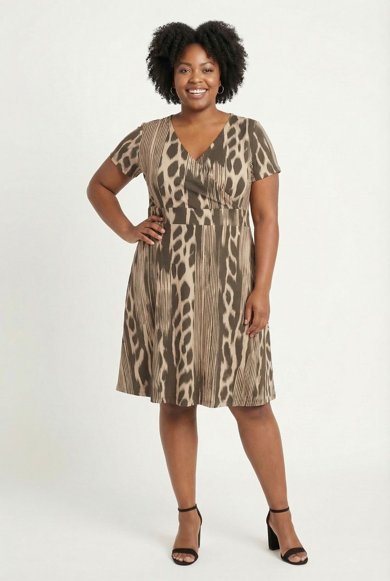 Combine seu Vestido Curto Animal Print com sandálias de salto para um look mais formal, ou tênis brancos para um estilo despojado e confortável. Adicione uma jaqueta jeans para dias mais frescos ou acessórios discretos para realçar a estampa. Bolsas neutras complementam perfeitamente o visual.