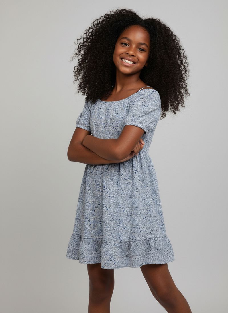 O Vestido Infantil Azul Floral, em 100% algodão e meia malha, oferece conforto e leveza. Com estampa floral, mangas bufantes e babado, garante um visual delicado e estiloso para a moda infantil.