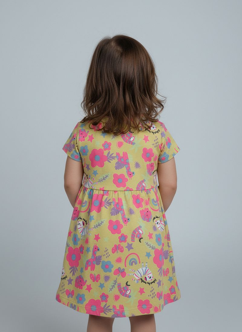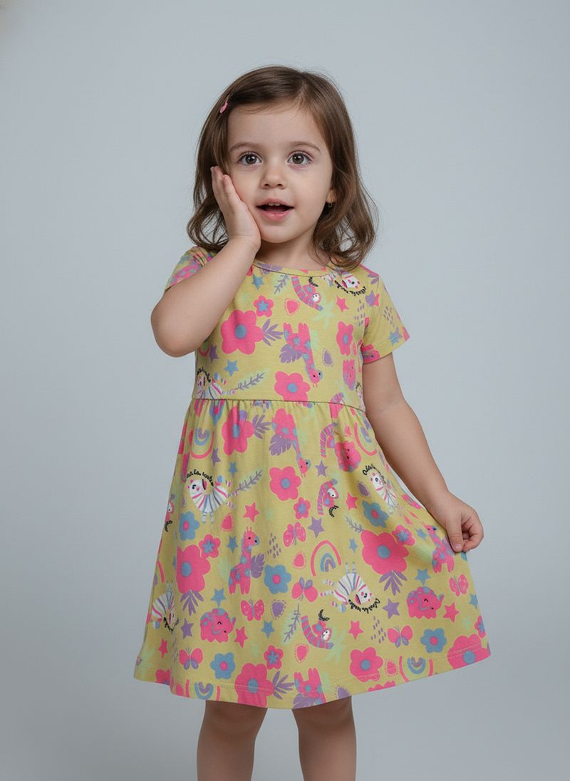 Celebre a alegria da infância com o Vestido Infantil de Malha Caedu. Confeccionado em meia malha, oferece conforto e liberdade para brincar. Seu design vibrante, com estampa de bichinhos e flores divertidas em amarelo claro, é perfeito para criar looks cheios de vida e estilo. Uma roupa infantil que inspira sorrisos!