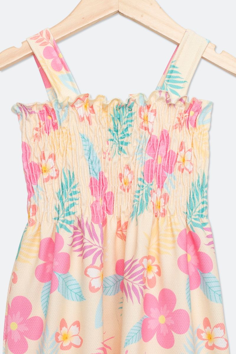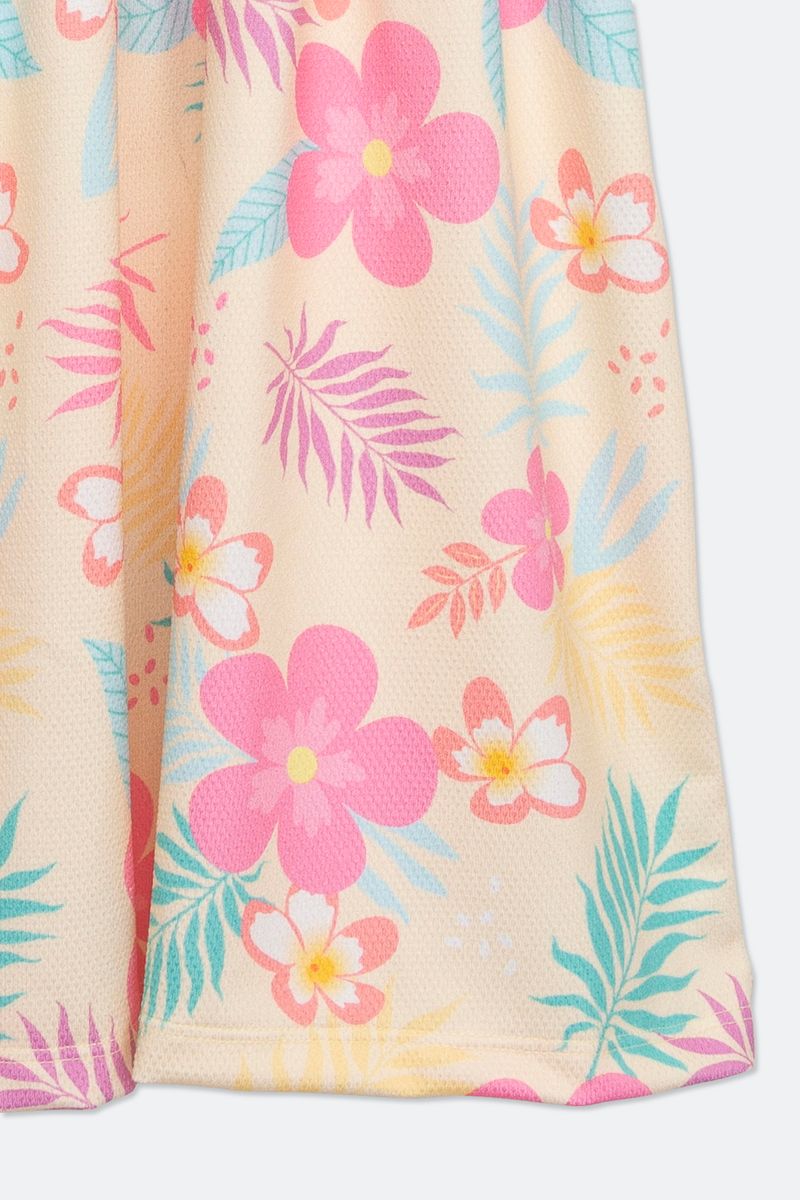 Vestido infantil com estampa floral, confeccionado em lastex. A peça possui decote quadrado, alças largas e comprimento médio com caimento solto.