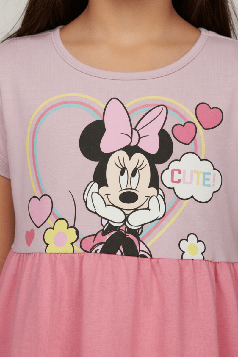Estampa: Minnie Mouse com corações e a palavra "CUTE"