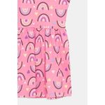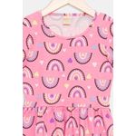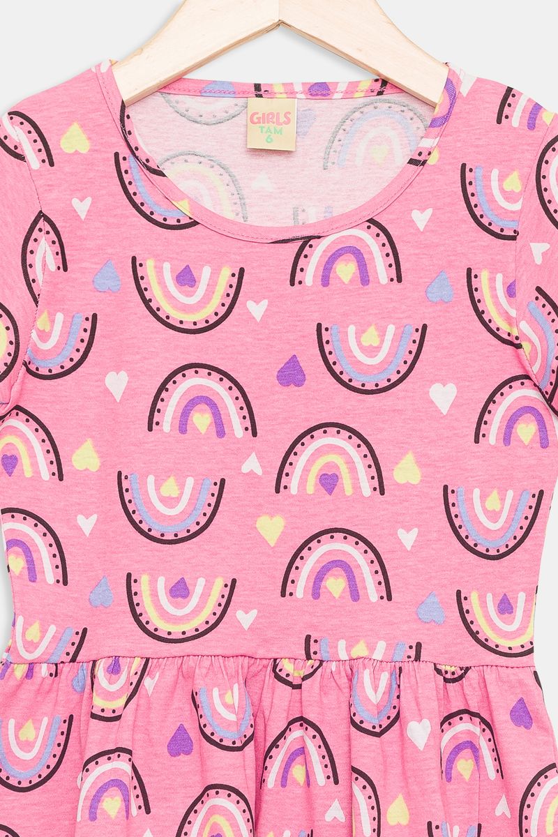 Vestido infantil rosa neon com estampa de arco-íris, moderno e cheio de alegria.
