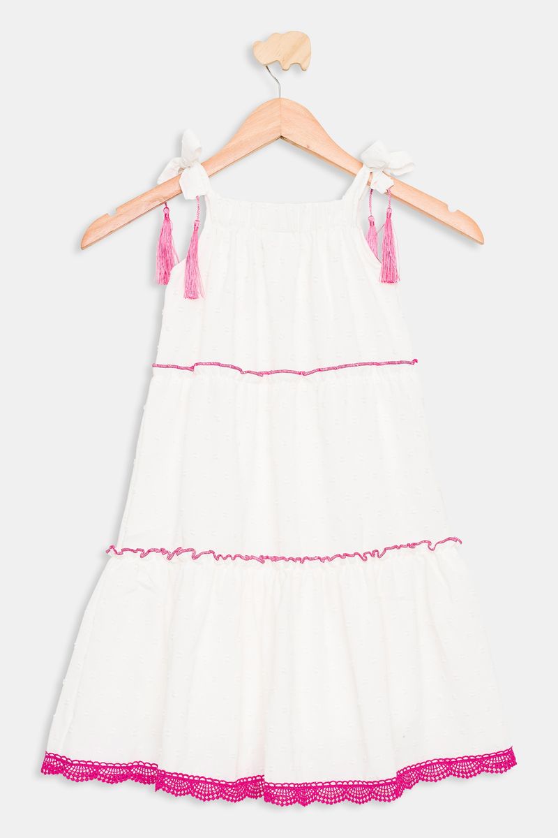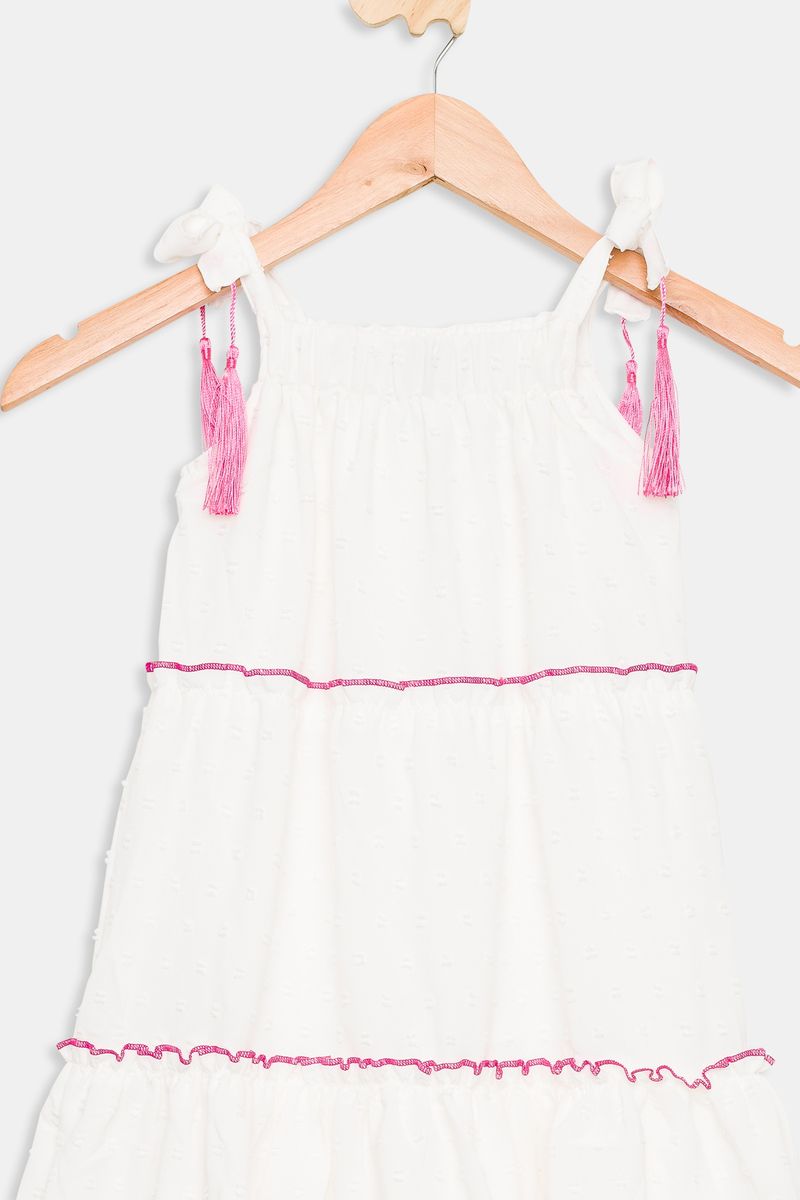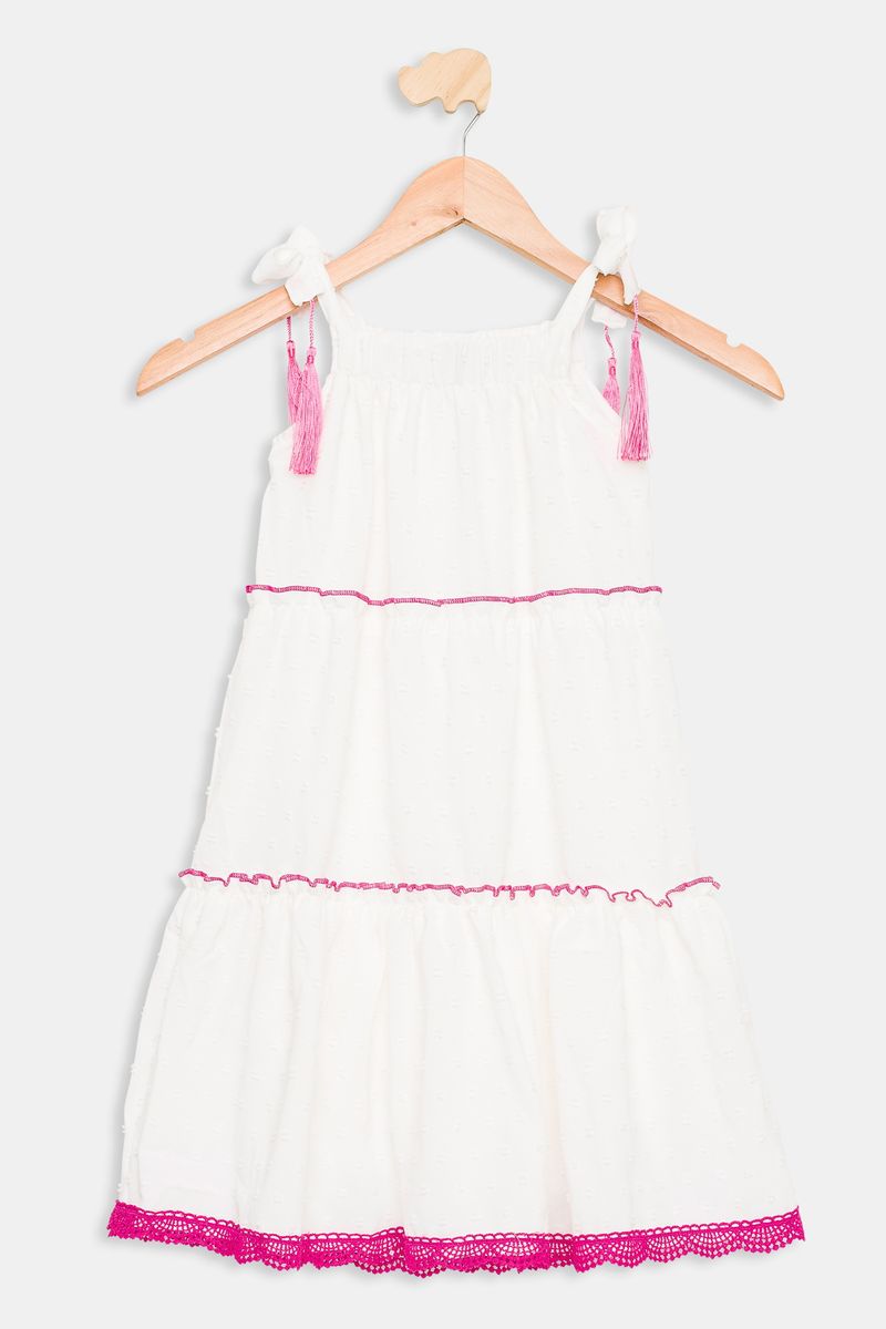 O Vestido Infantil Branco e Pink Caedu é a roupa infantil perfeita! Com design bicolor e detalhes como borlas e renda rosa vibrante, esta peça versátil e cheia de estilo garante conforto e um toque de moda.