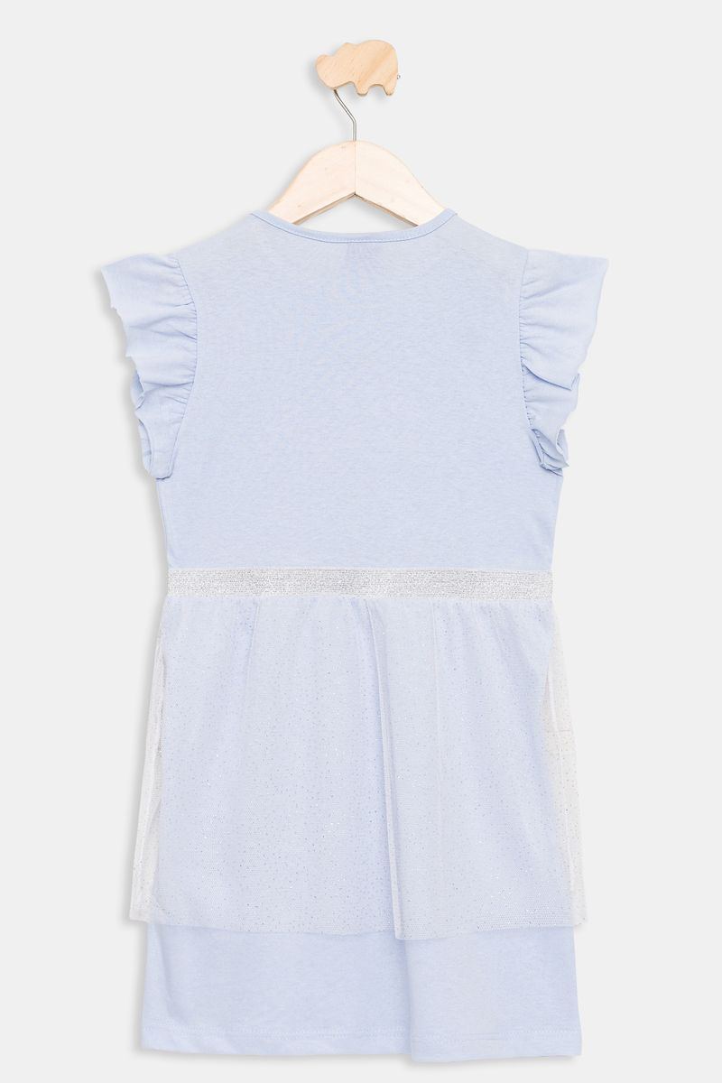 Vestido infantil azul claro com estampa do Stitch e tule delicado. Charmoso e confortável.