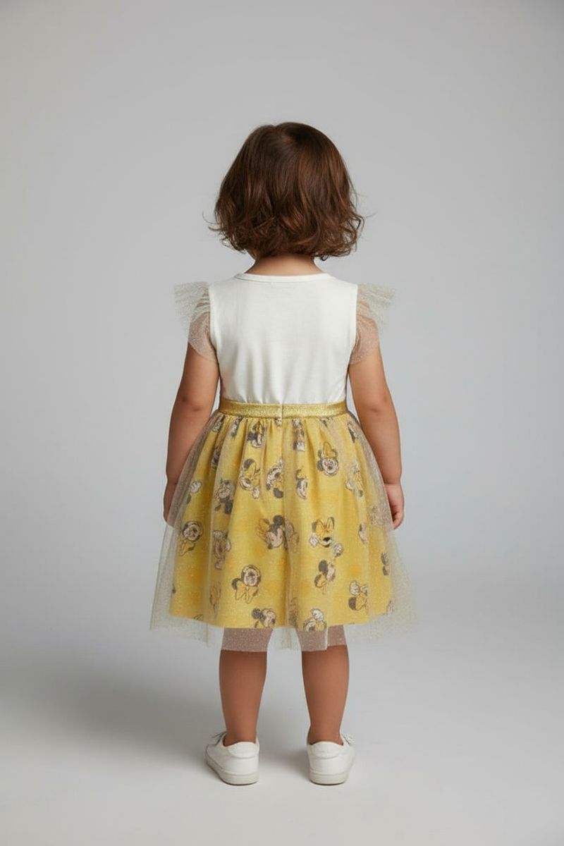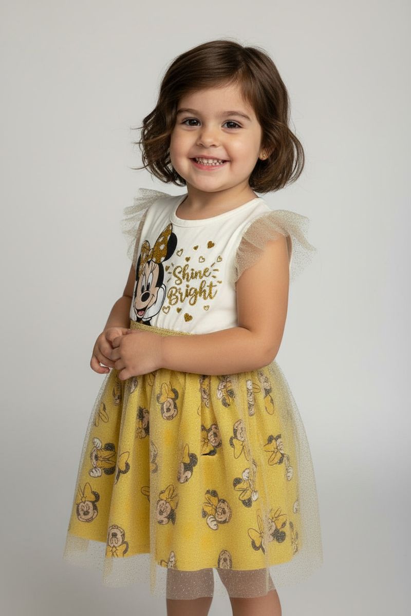 Sua pequena vai brilhar com o Vestido Minnie Mouse Amarelo Caedu! Com estampa vibrante da Minnie 'Shine Bright', tule glitter e cinto dourado, esta roupa oferece magia e conforto. Perfeito para momentos especiais.