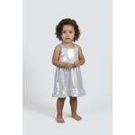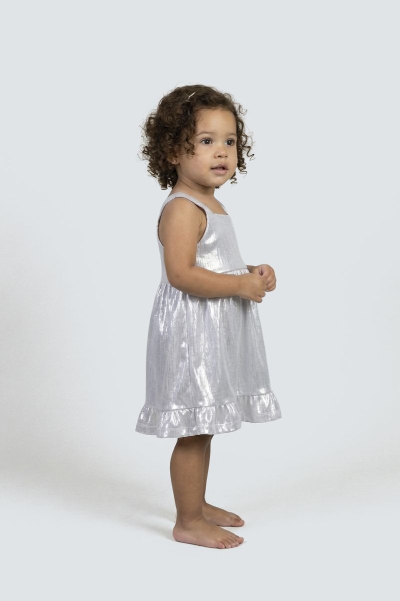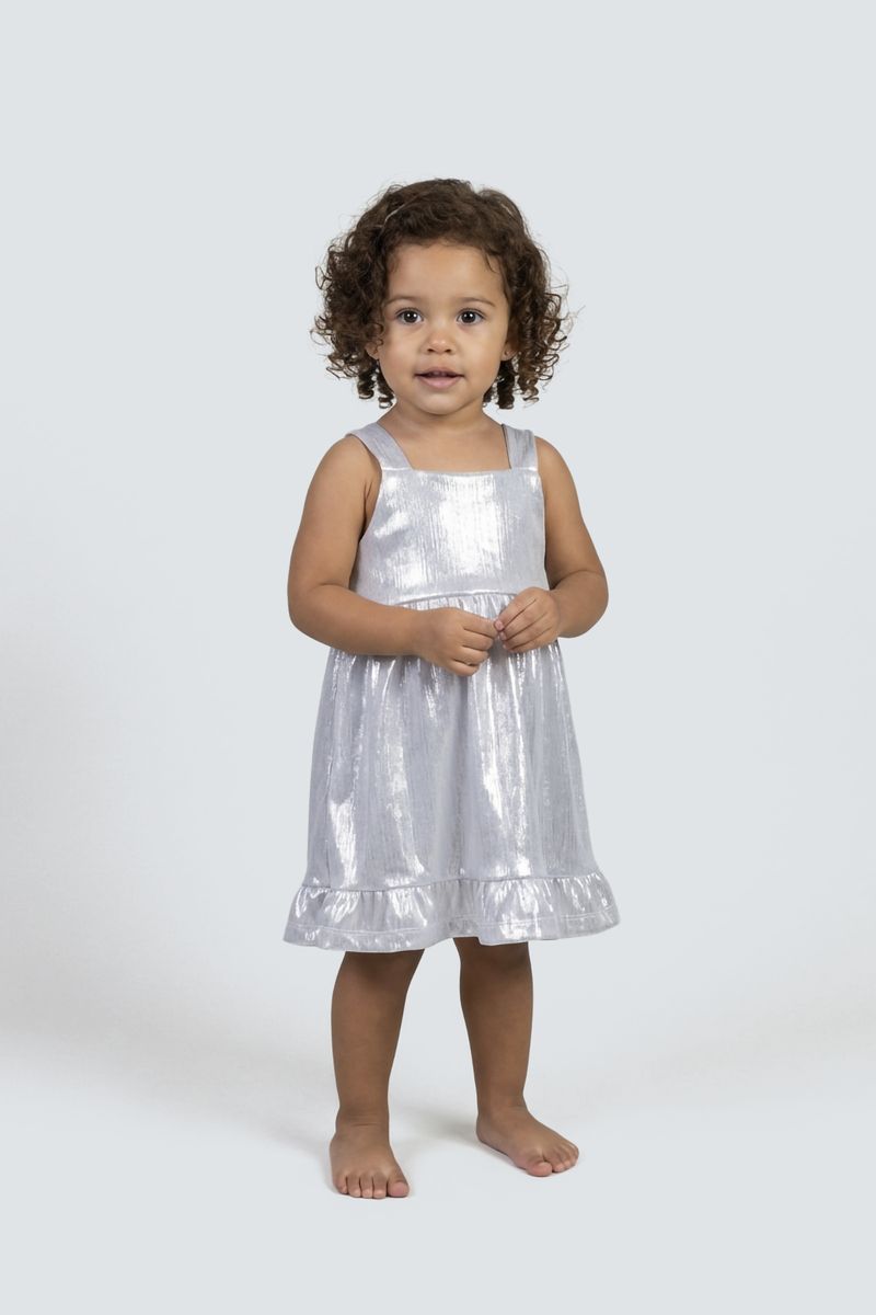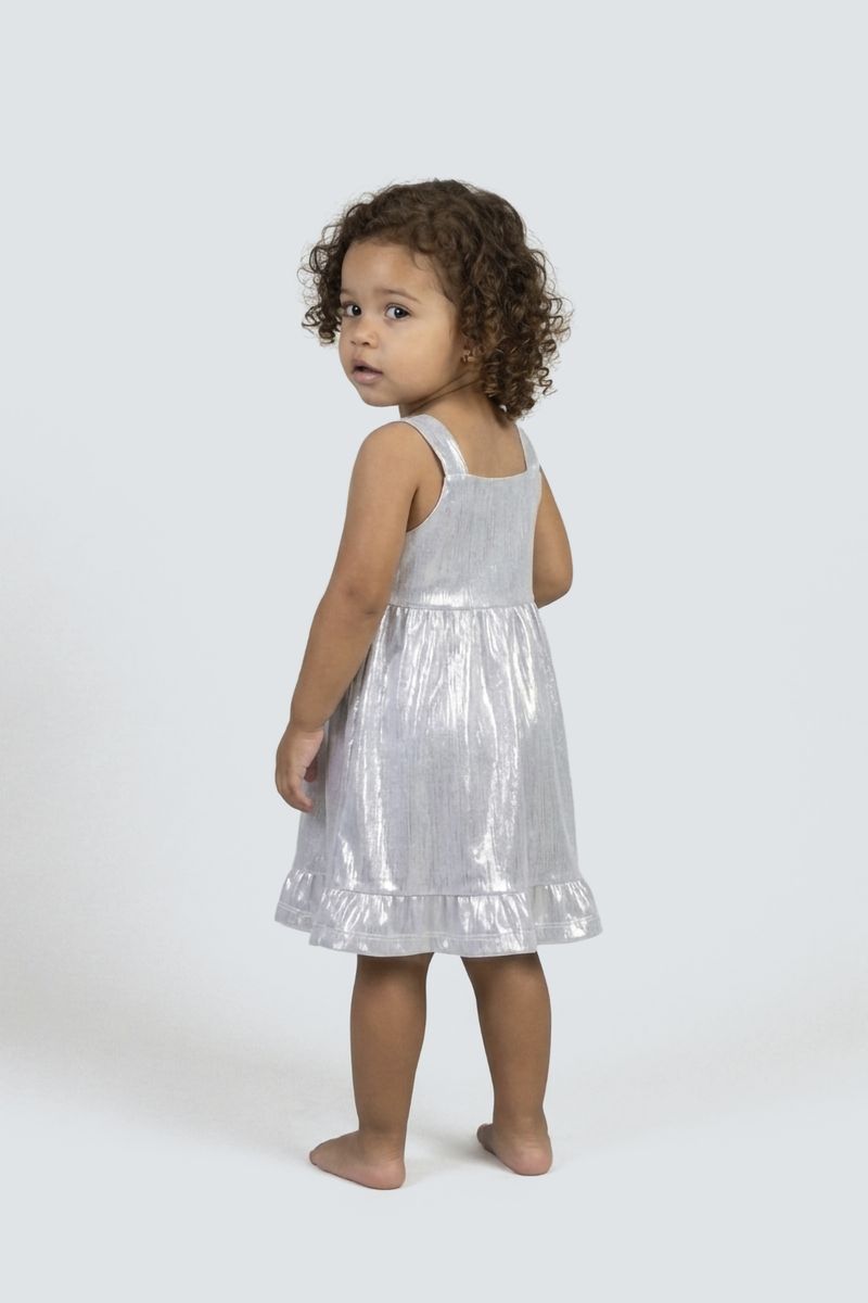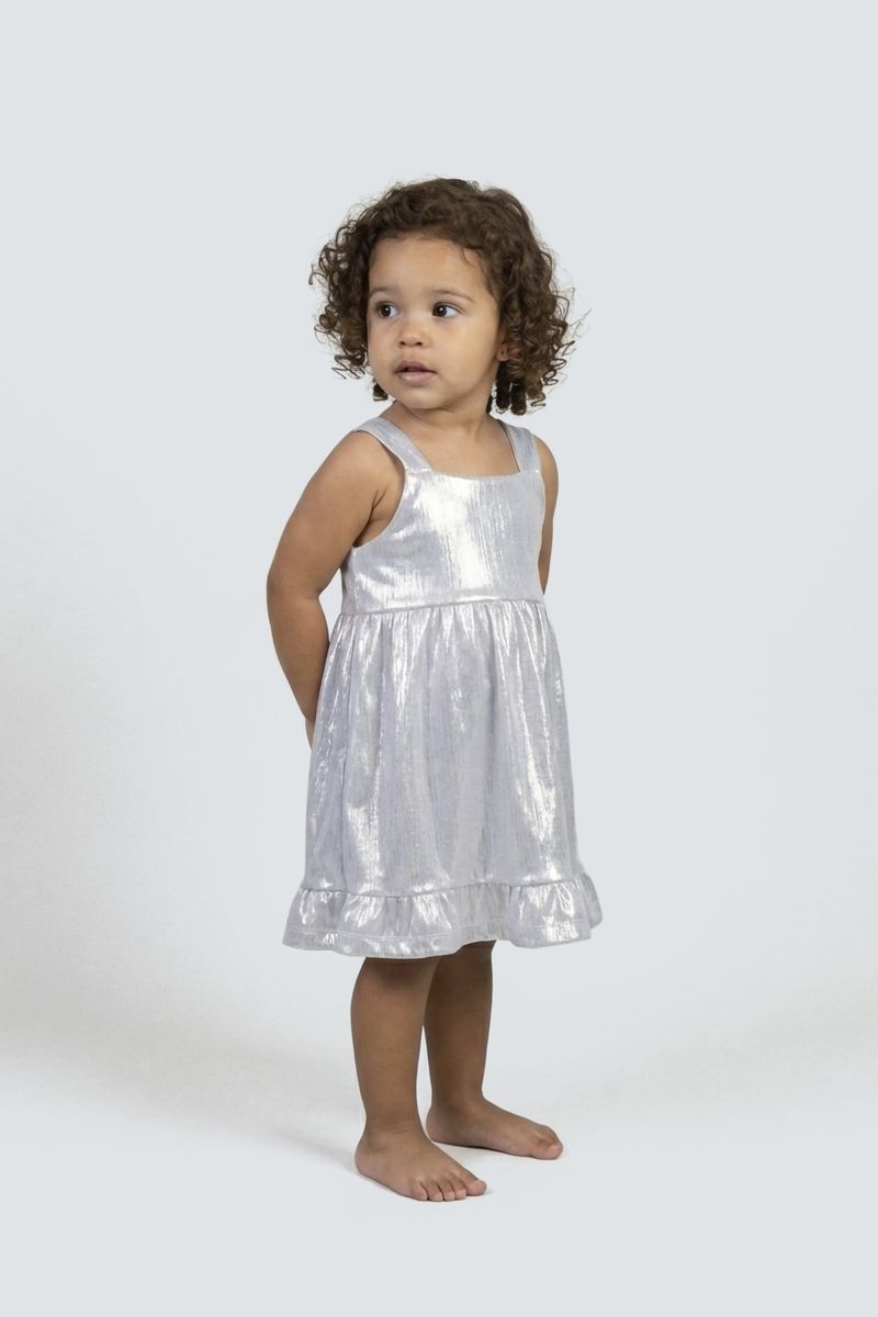 Este deslumbrante vestido de festa infantil da Caedu é a escolha perfeita para sua pequena brilhar. Com um acabamento prateado cintilante e um charmoso babado na barra, ele oferece um visual festivo e luminoso. Suas alças largas e decote quadrado garantem conforto e estilo para todas as celebrações.